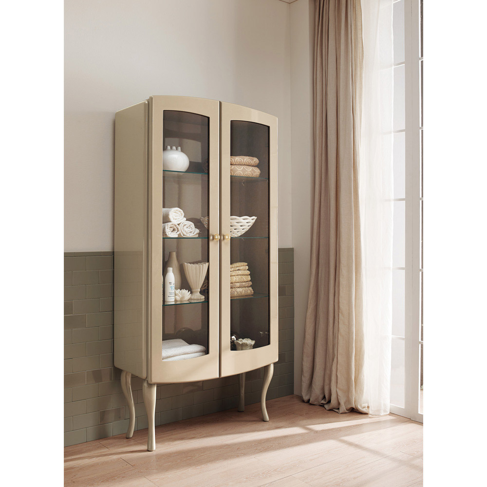 Showcase h 180cm in MDF complete with two doors with three internal glass shelves . The showcase is in lacquered single-colour Taupe Ā glossy externally and matt lacquered internally. The flower shaped brass knobs are included.