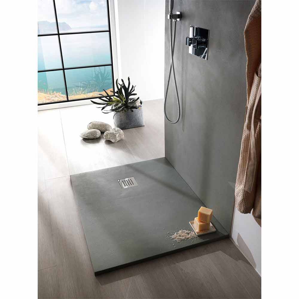 Modern shower tray 120x90 in concrete effect resin with steel grid.
