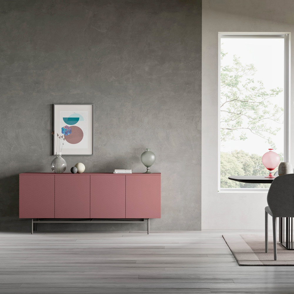 This sideboard for the living room has a structure made of matt minio color lacquer, with wooden doors in the original rhombus finish minio matt lacquer with a quilted motif. Inside the door compartments, which can be opened with a push & pull system, there are shelves in bronzed glass. The resistant base is in burnished metal and the top has a thickness of 12 mm.