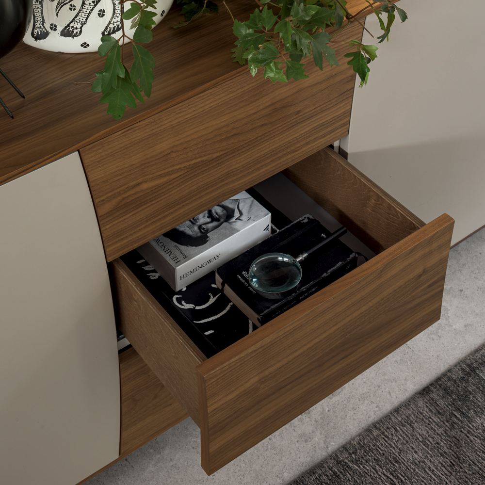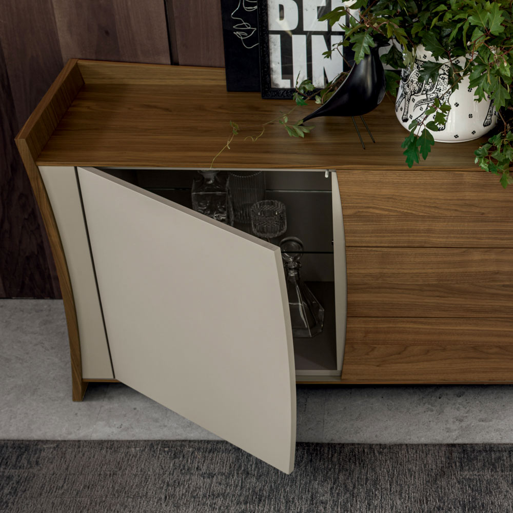 This sideboard for the living room has a structure made entirely of wood veneered in Canaletto walnut finish which delicately stands out beyond the top, framing it with a shaped splashback.