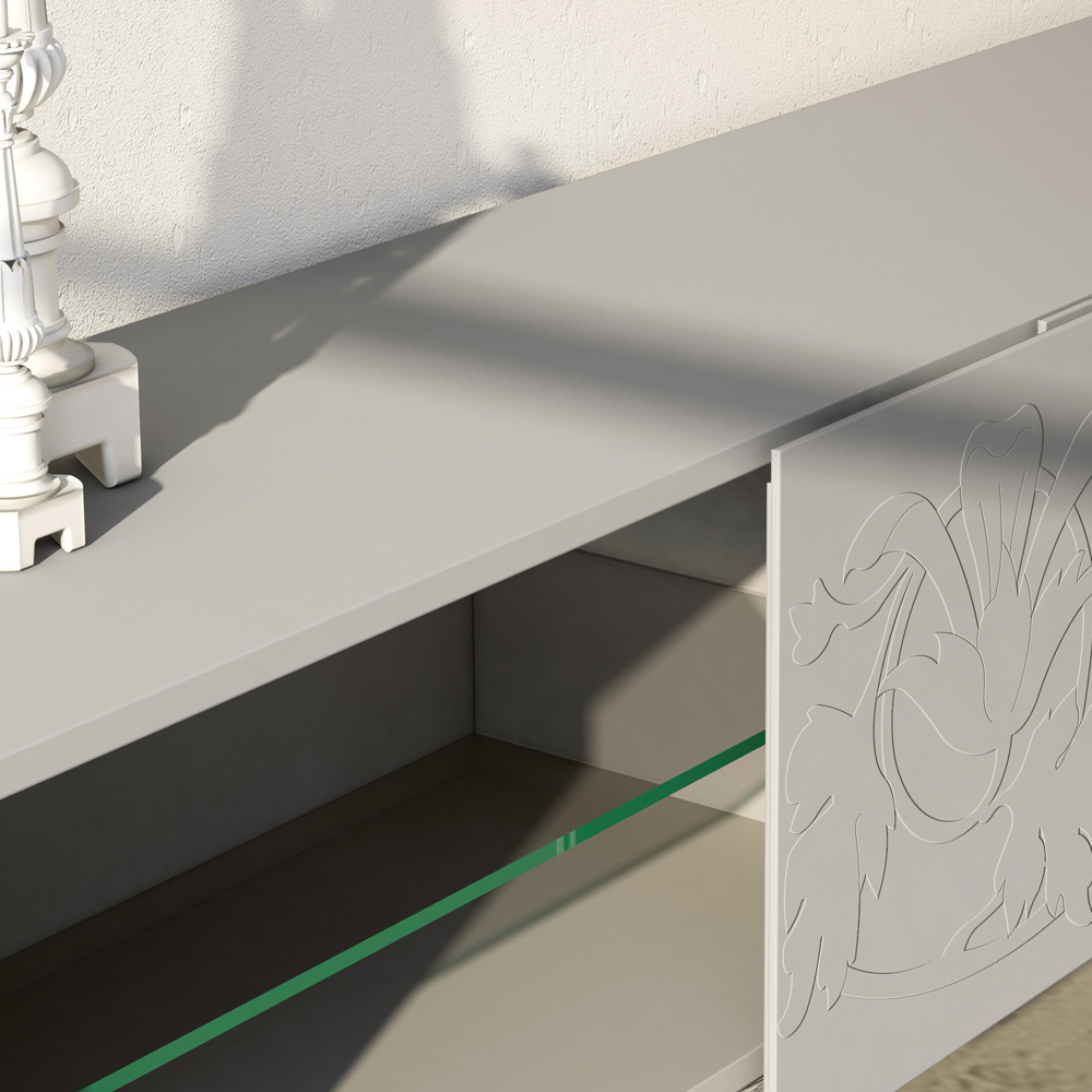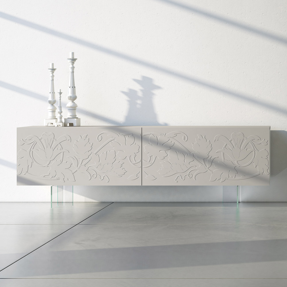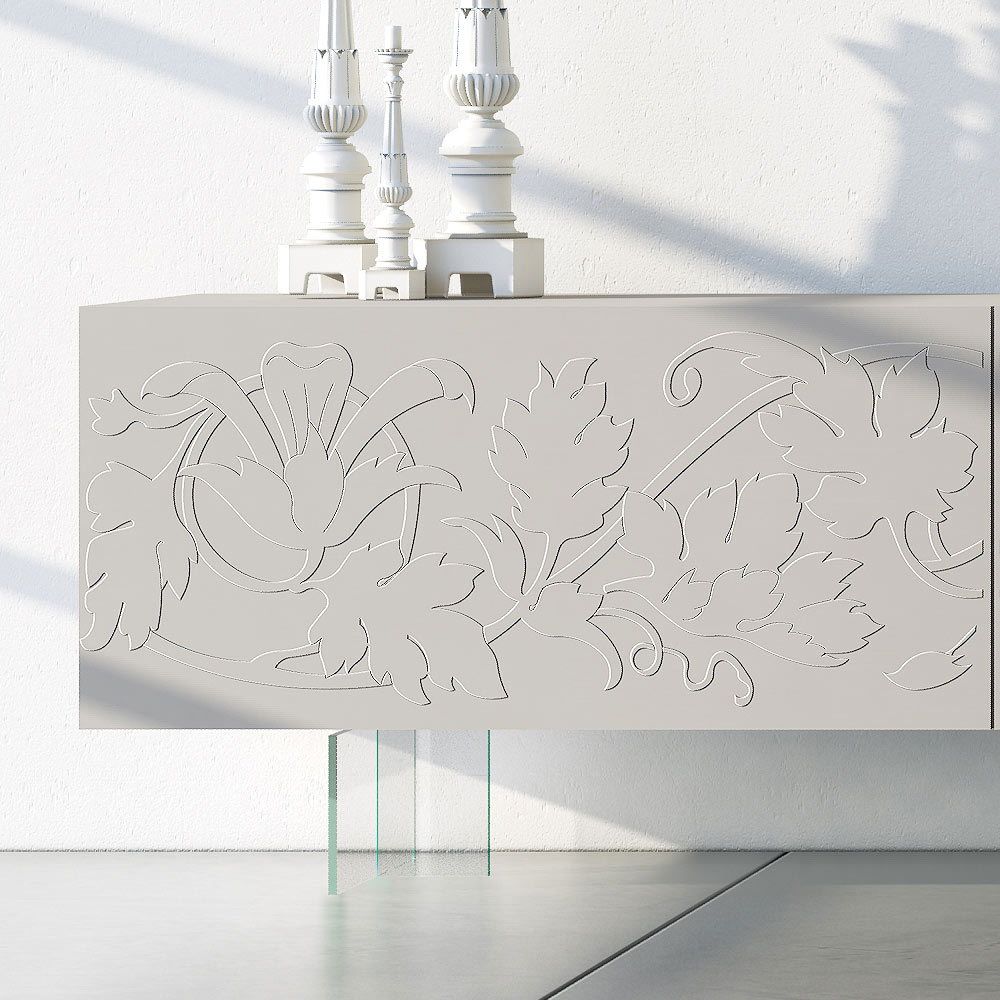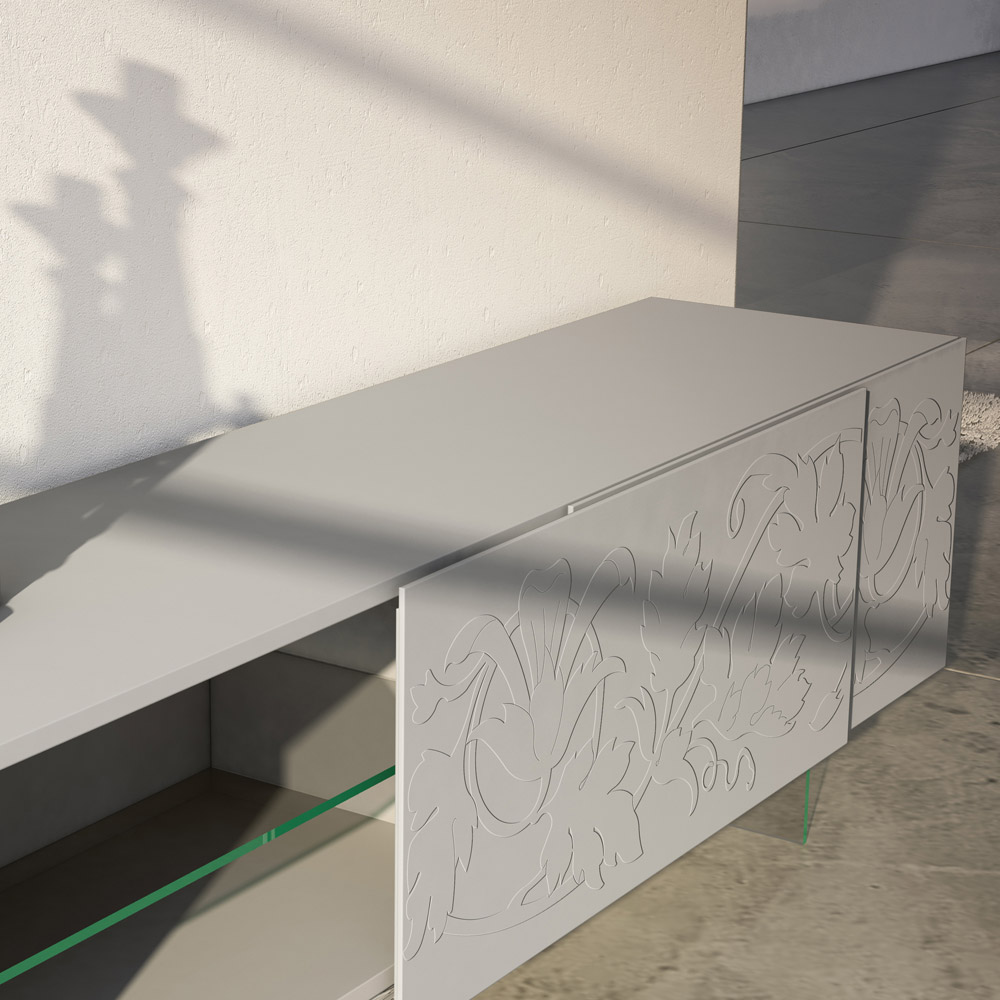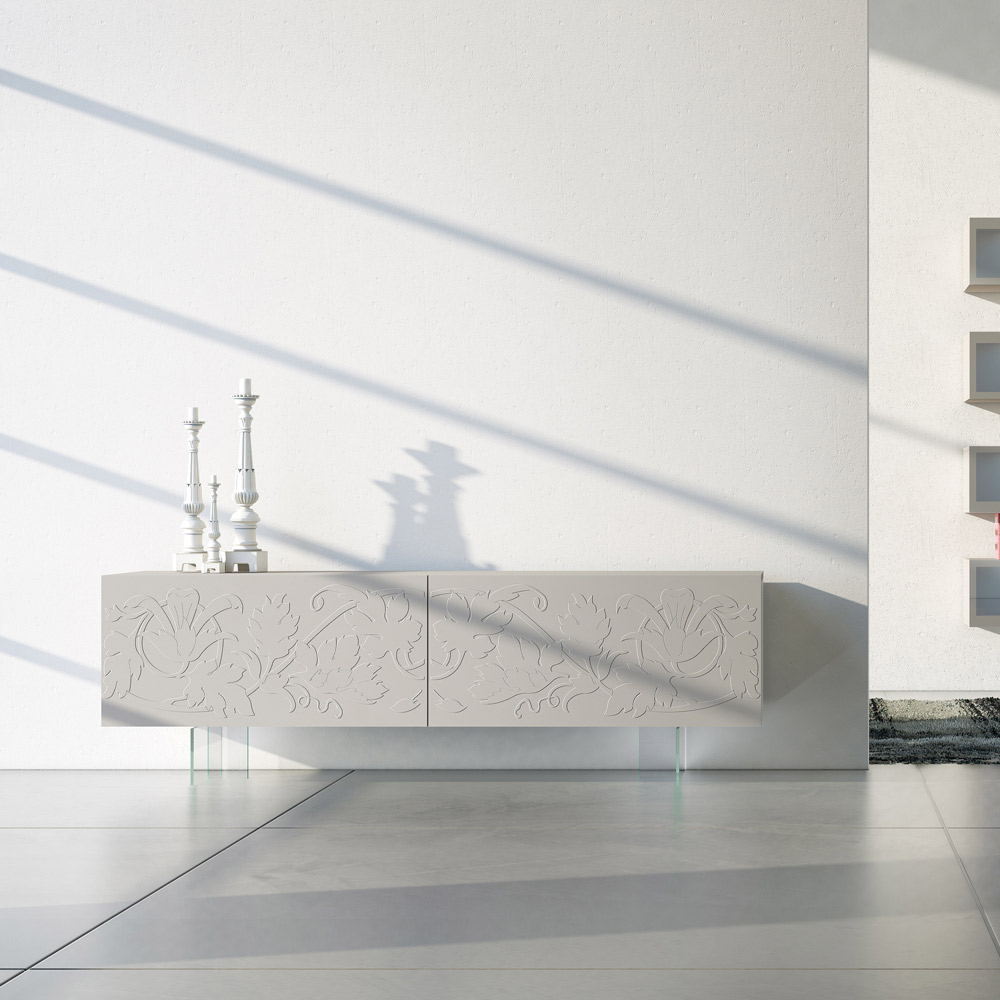 Modern sideboard with white matt lacquered MDF structure composed of 2 coplanar sliding doors which guarantee great functionality and practicality and with extra-clear glass feet . This product is full of taste and design thanks to its elegant and refined finishes and the unique bas-relief decoration of the doors. The various materials used for the construction offer great quality and resistance over time, giving the product that unique and unforgettable touch.