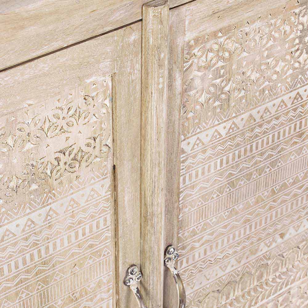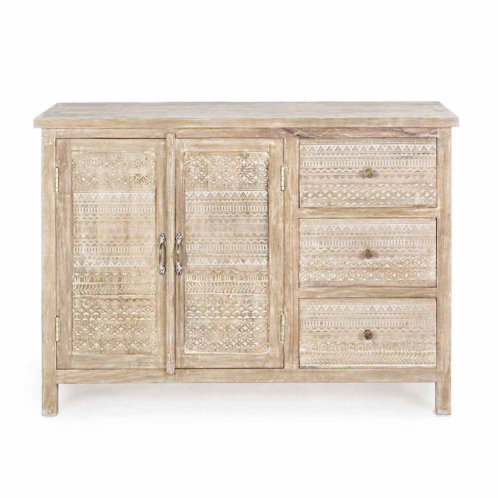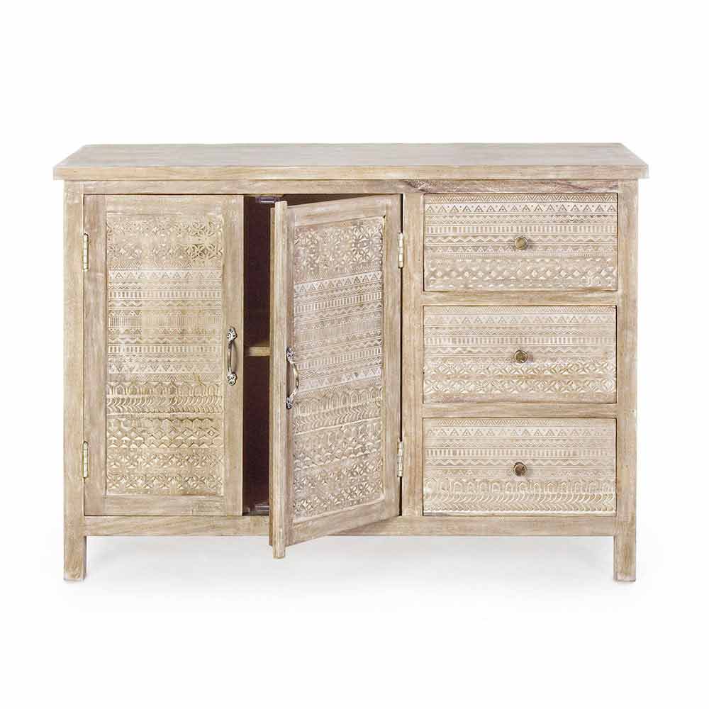 Structure in mango wood with hand inlaid decorations, back and bottom drawers in mdf . Finishing based on nitrocellulose.