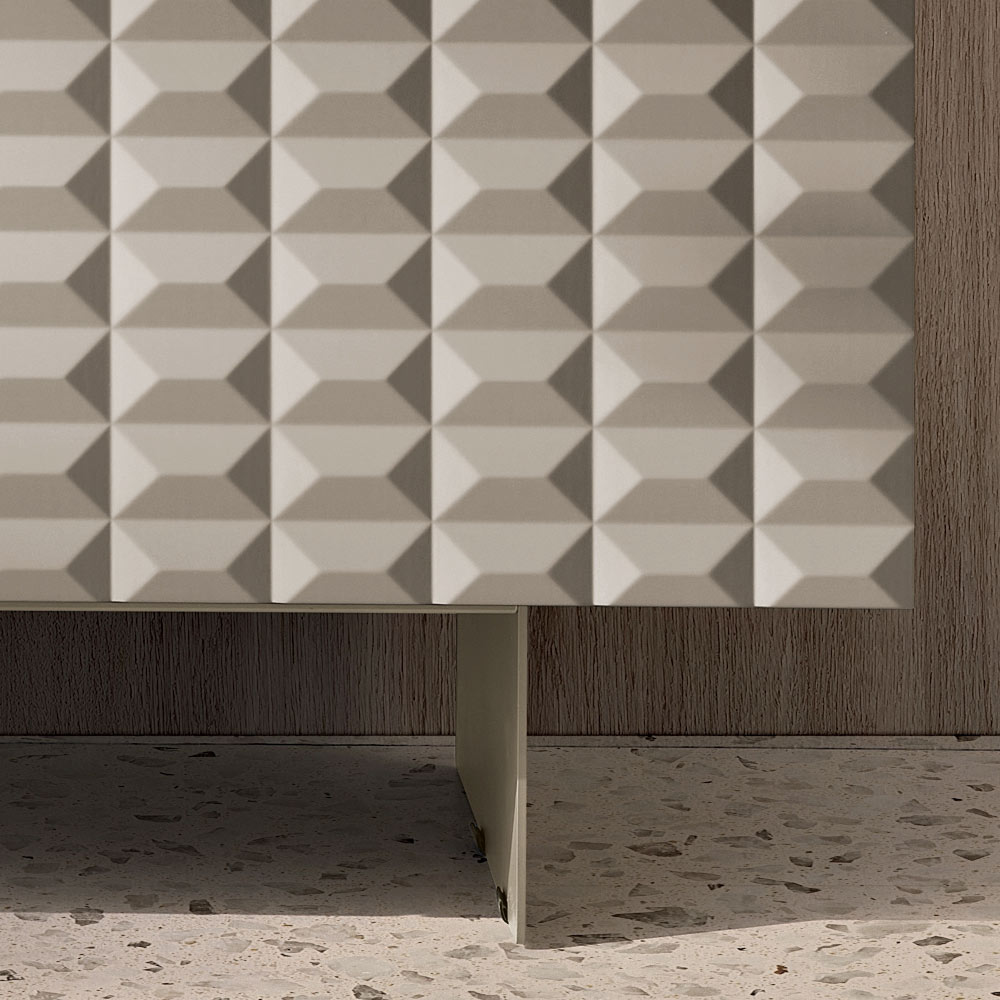 The PVC-coated MDF doors feature a three-dimensional geometric texture reminiscent of the famous diamond-point reliefs, creating a fascinating interplay of light and shadow. This detail adds visual depth and makes the sideboard a true focal point of the room.