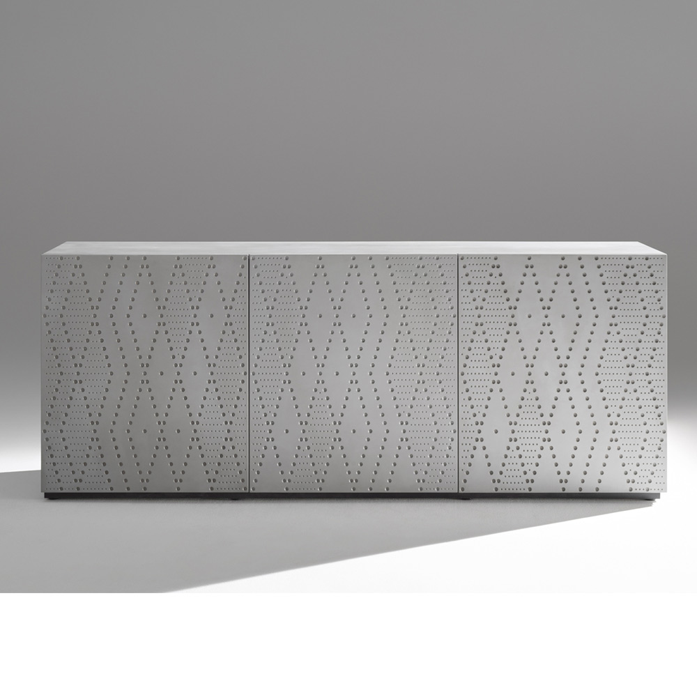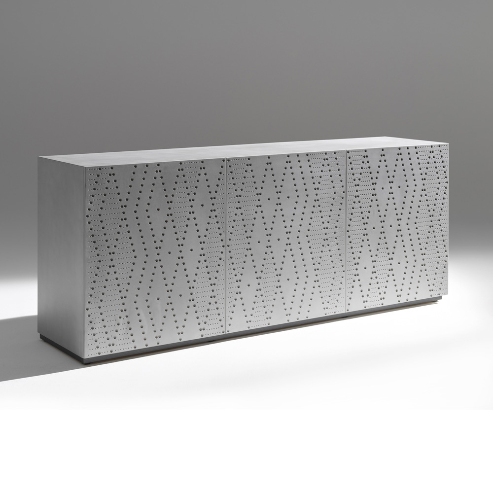 A sideboard with a textured, contemporary feel, defined by a refined, speckled, foundry-look aluminum-effect decoration that covers the doors and creates a sophisticated interplay of light and depth. A dramatic piece designed for modern, elegant, and sophisticated spaces.