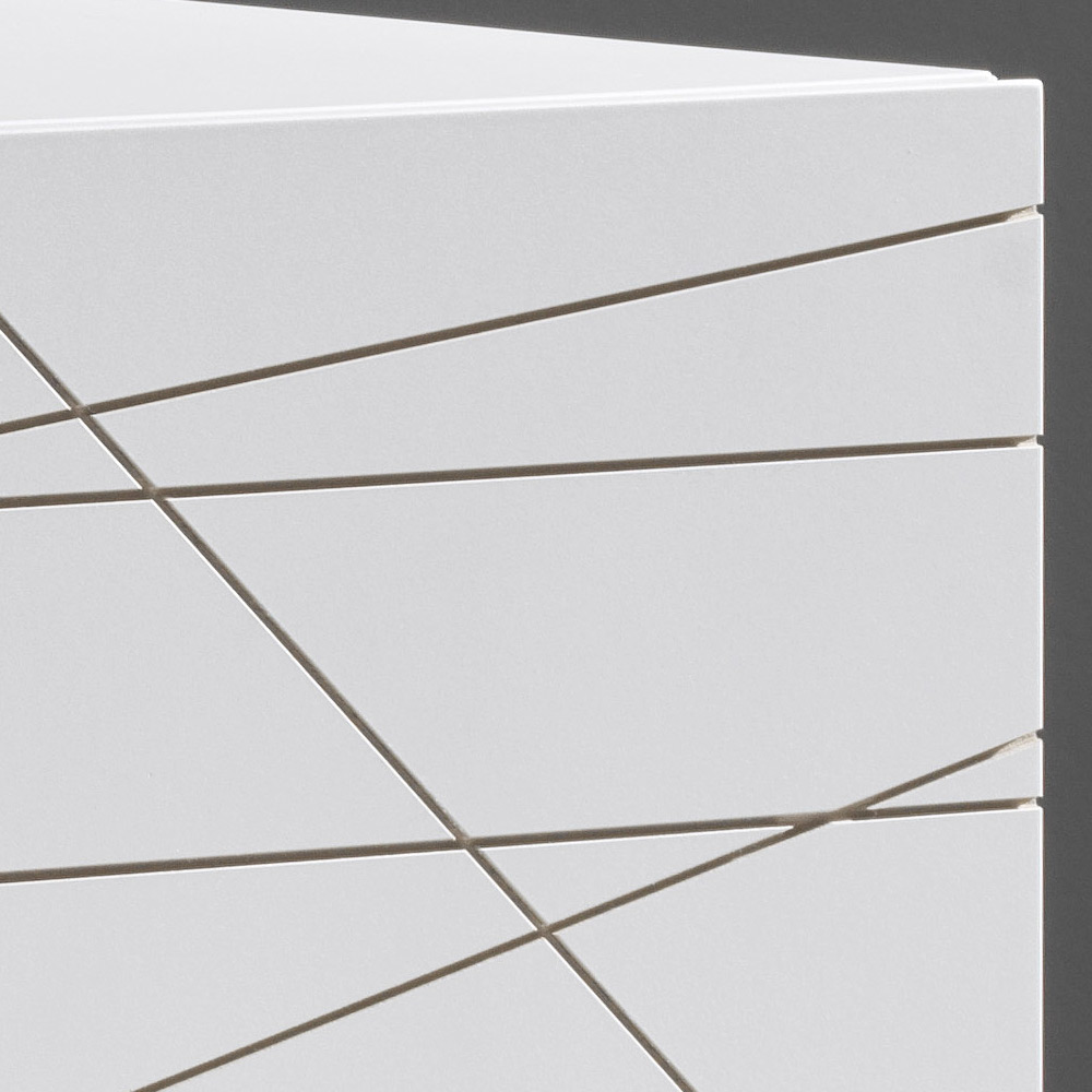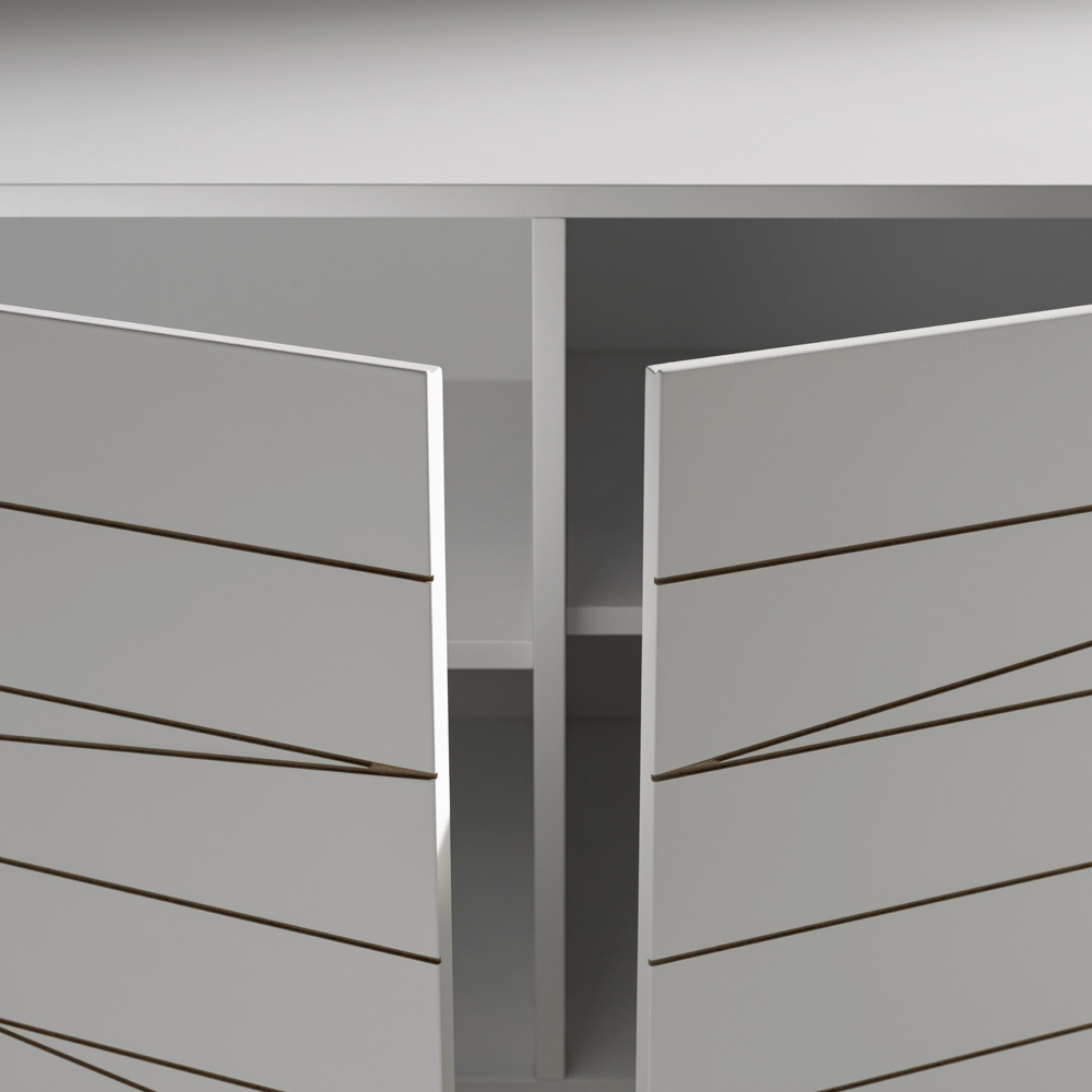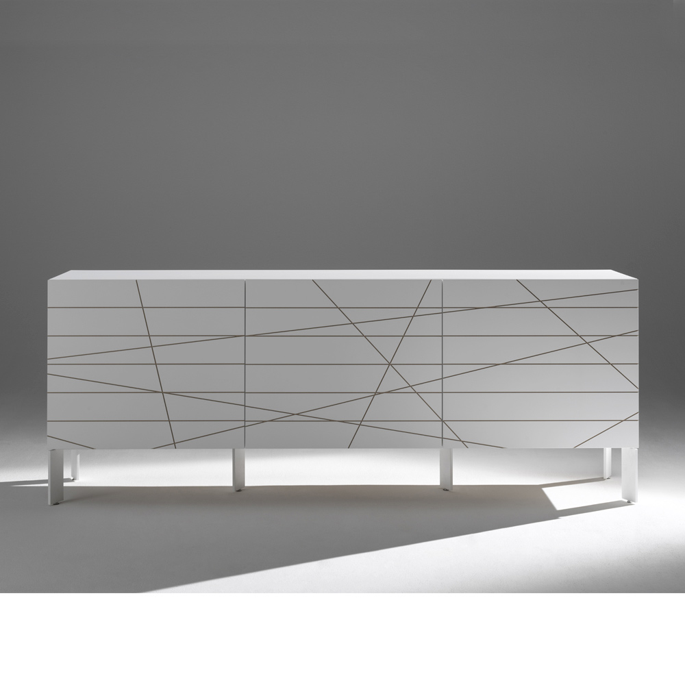 A visually striking sideboard, designed for contemporary and designer spaces. The doors feature a refined engraved graphic design, creating a dynamic interweaving of lines and adding movement to the surface, transforming the piece into a truly decorative element.