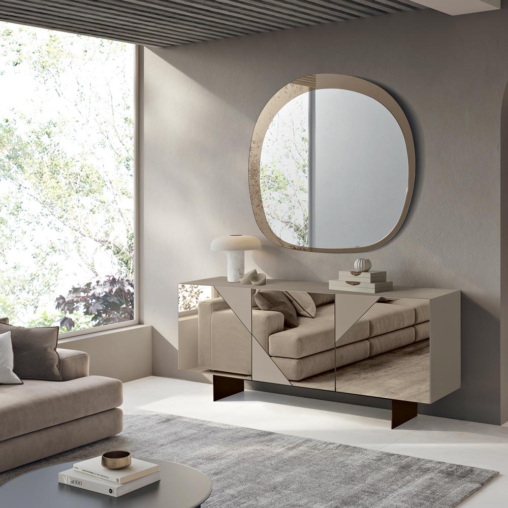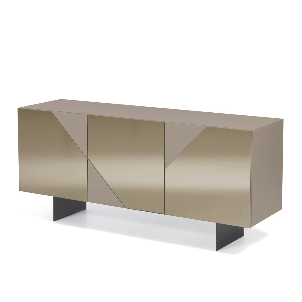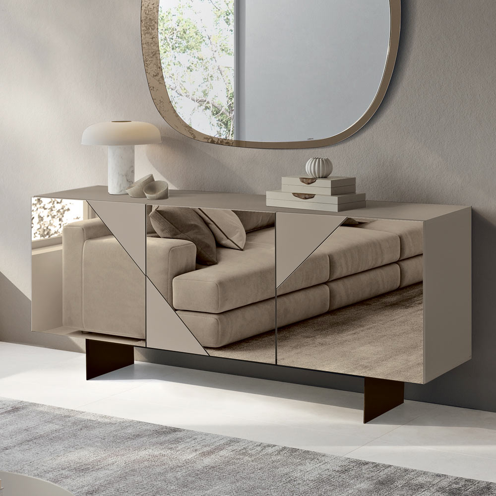 The MDF doors are covered in mirrored glass that alternates glossy and matte surfaces, creating a refined geometric interplay that captures the light and provides visual depth. This contrasting material makes the sideboard elegant and dynamic, perfect for modern and sophisticated spaces.