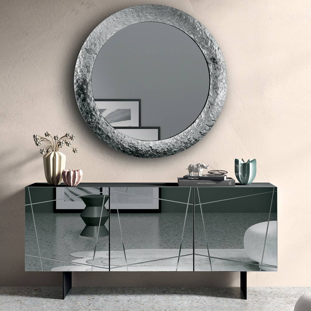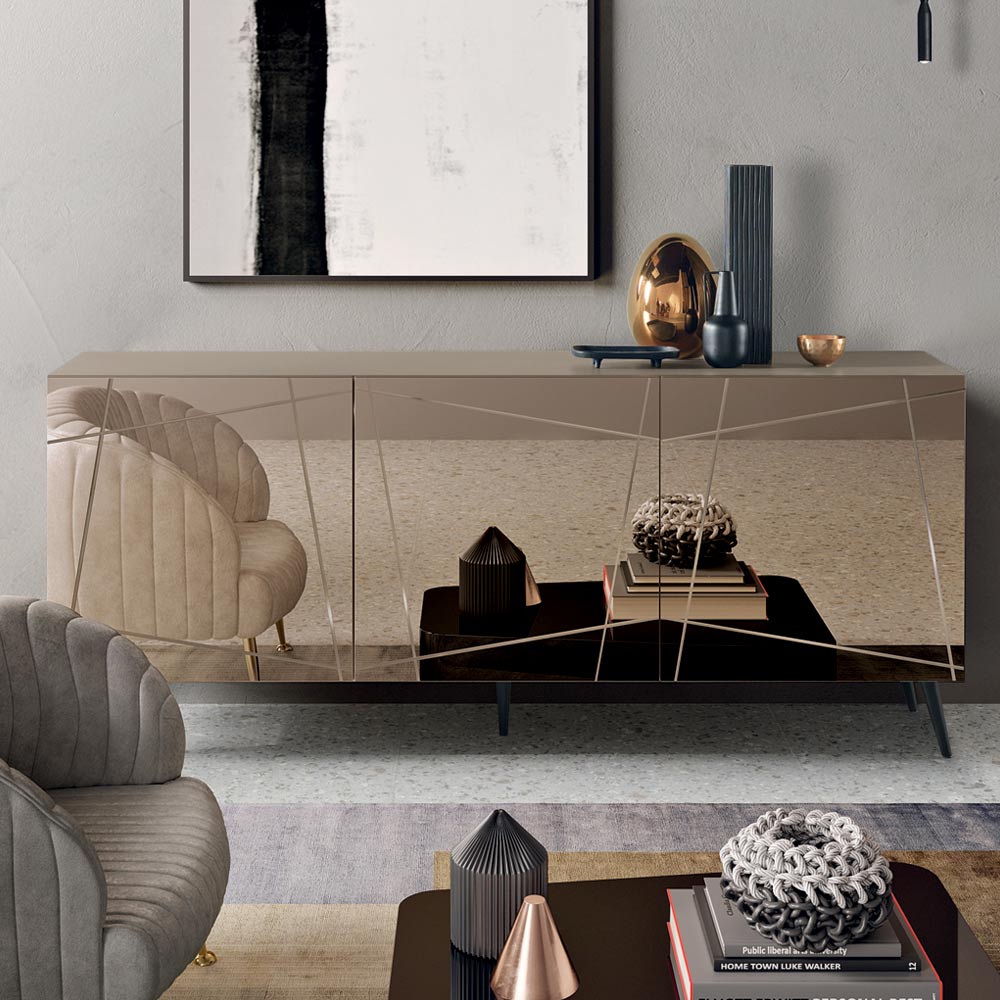 Made in Italy designer sideboard with engraved mirrored glass doors and metal base