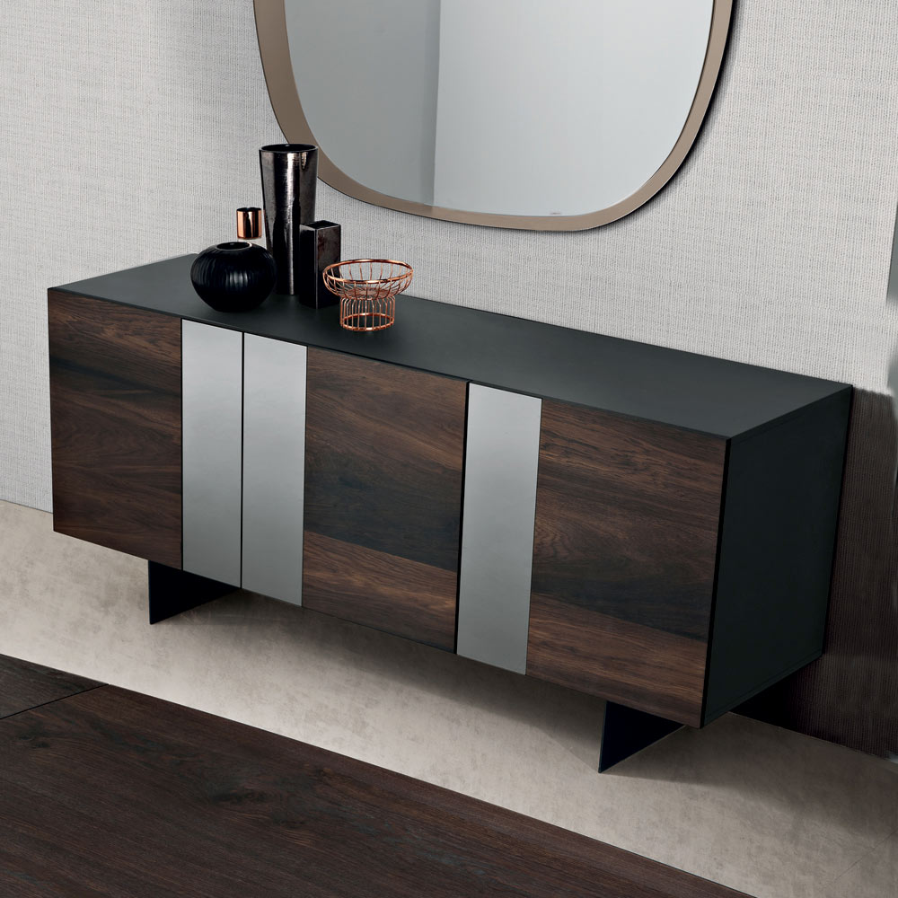 An elegant , Made in Italy designer sideboard , ideal for stylishly furnishing your living room or dining area . Its contemporary design stands out for its refined balance of natural materials and reflective surfaces, creating a furnishing accessory with a striking aesthetic impact.