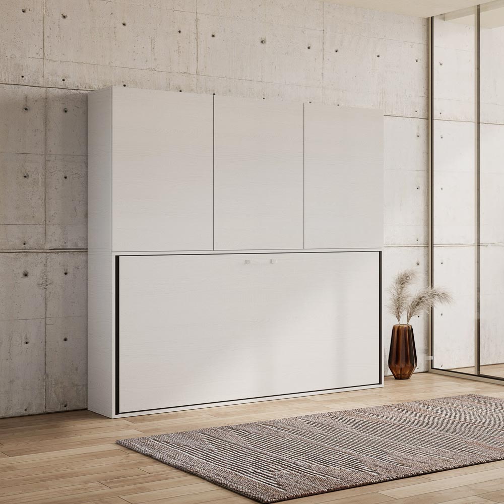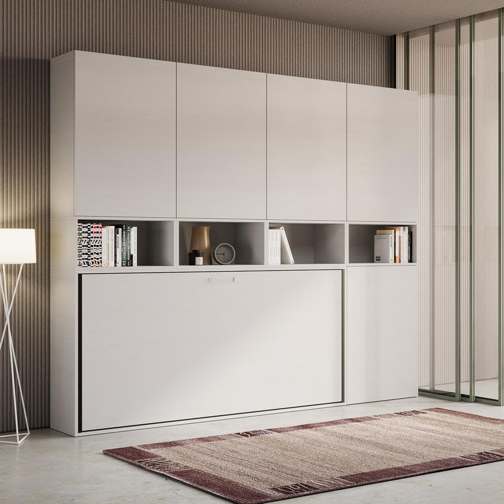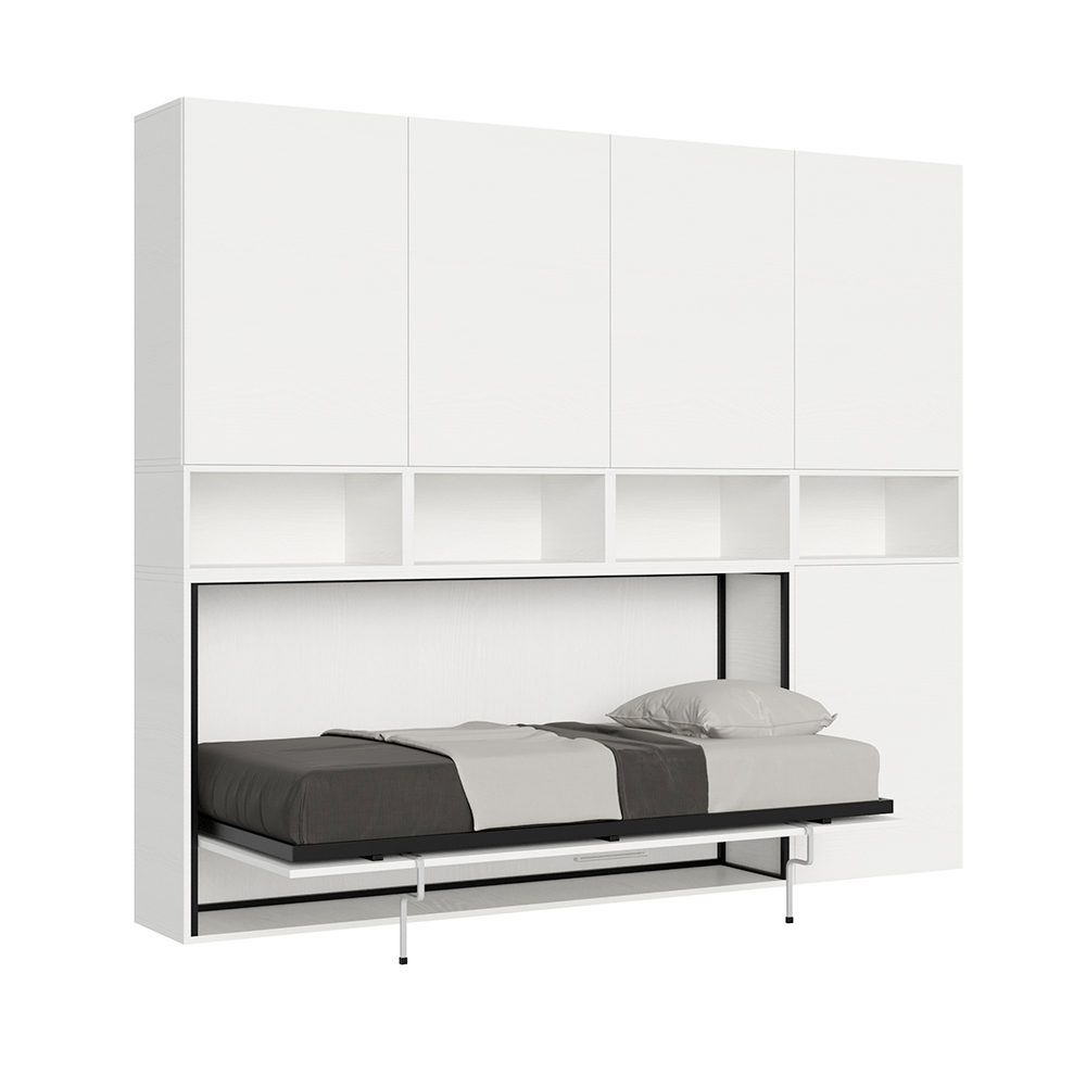 Horizontal foldaway bed made with a structure made of 18 mm thick ennobled particle board panels, bed base structure in reinforced iron painted with epoxy powder in embossed aluminium colour.