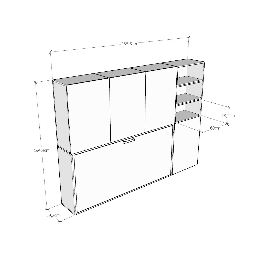 - COMPOSITION G : single foldaway bed that transforms into a bookcase/wardrobe with nine compartments (three with door and internal shelf and six open) - Closed bed against the wall: 266.5 x 39.2 x height 194.4 cm / Open bed: 266.5.9 x 106 x height 194.4 cm