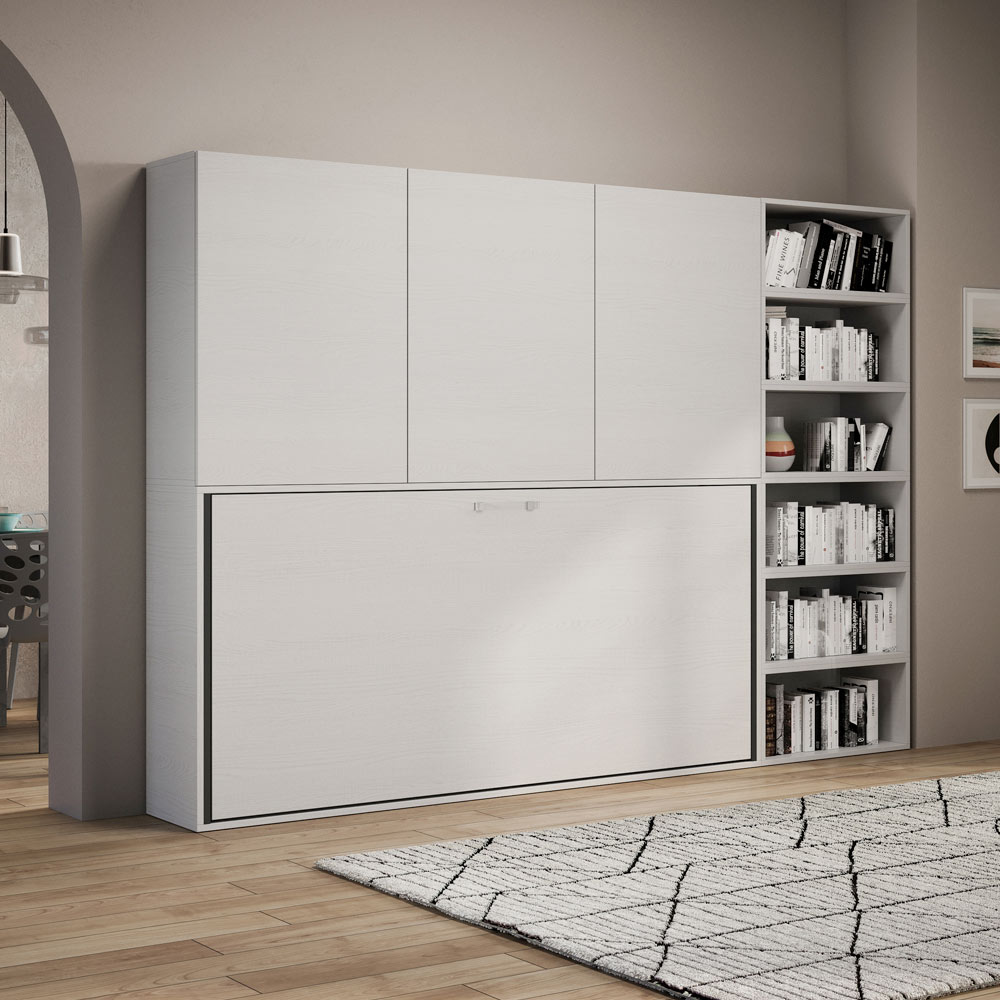 - COMPOSITION C : single foldaway bed inserted in a multifunctional bookcase. The bookcase/wardrobe has nine compartments of different sizes (five with doors, each with an internal shelf and four open compartments) - Closed bed against the wall: 266.5 x 39.2 x height 226.7 cm / Open bed: 266.5 x 106 x height 226.7 cm