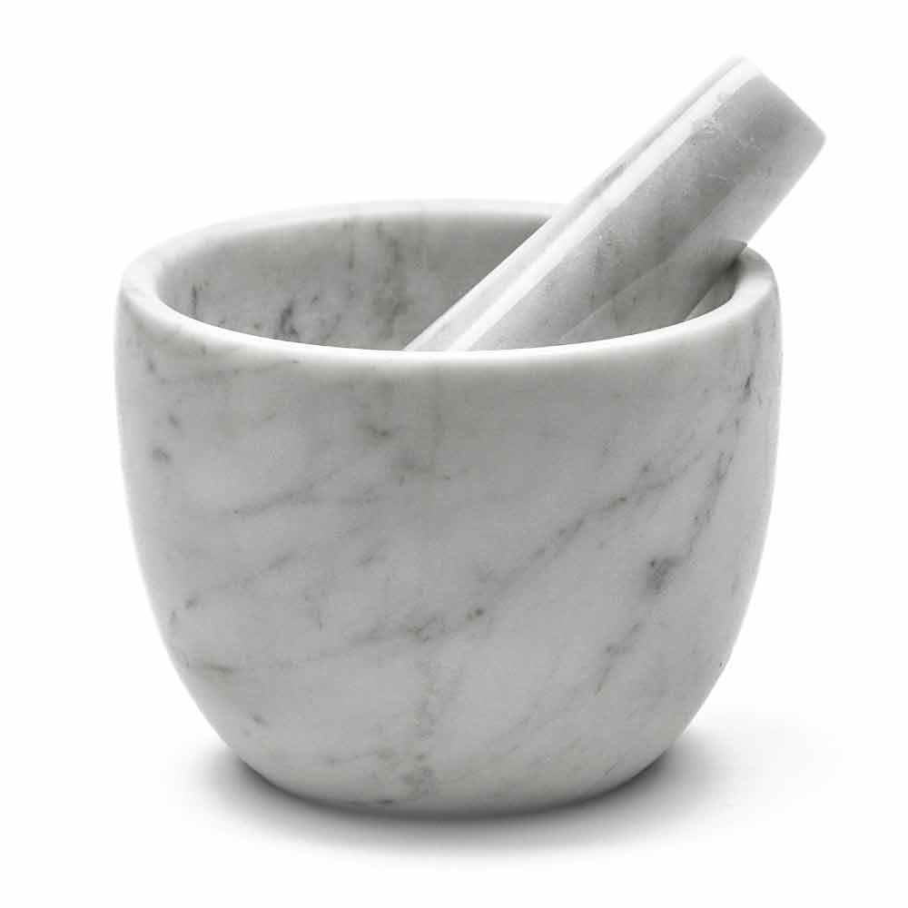 Small mortar with pestle entirely made of high quality white Carrara marble . It is a unique piece as each block of marble used differs from the others for veins and shades.