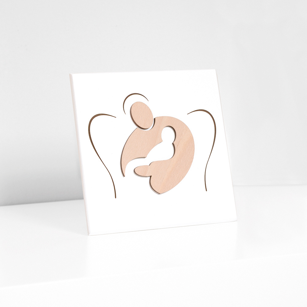 Holy picture with natural wood application of a mother hugging a child and laser engraving. White lacquered wooden panel with support foot and hole to hang it on the wall.
