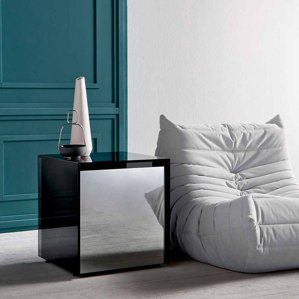 The peculiarity is given by the smoked glass with which it is made, used for the external structure, while the "I see I do not see" effect of the internal drawer in black wood create a refined and elegant construction.