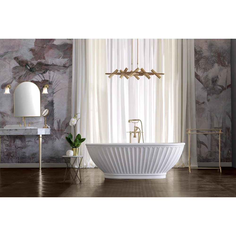 Freestanding bathtub in Solid surface, a mixture of acrylic resin modified with mineral compounds, without overflow . The inside of the tub is glossy white and the outside is matt white. This mixture is highly renewable, homogeneous and 100% non-porous and therefore waterproof.