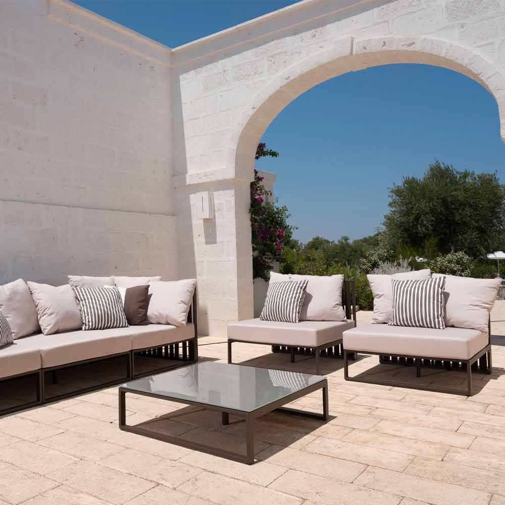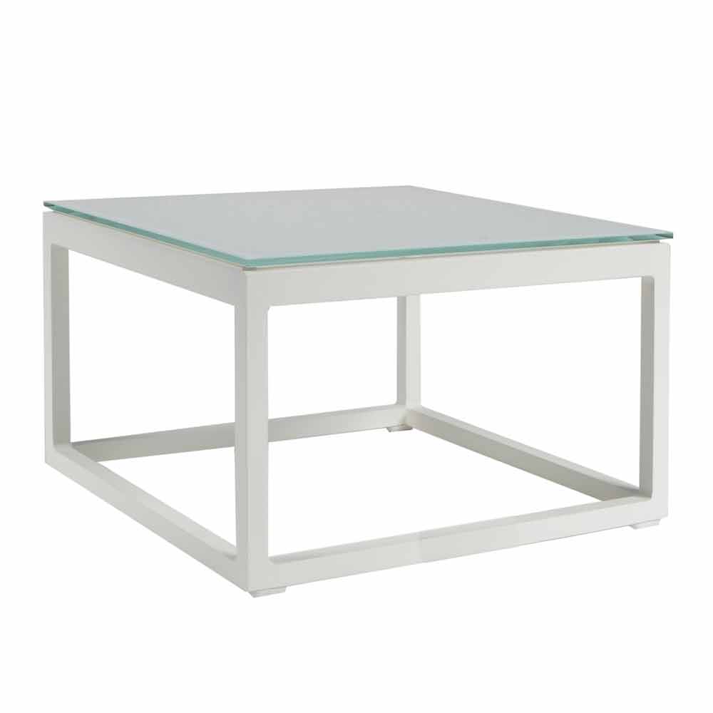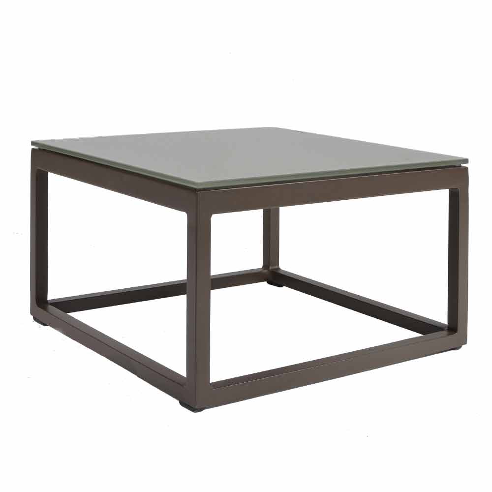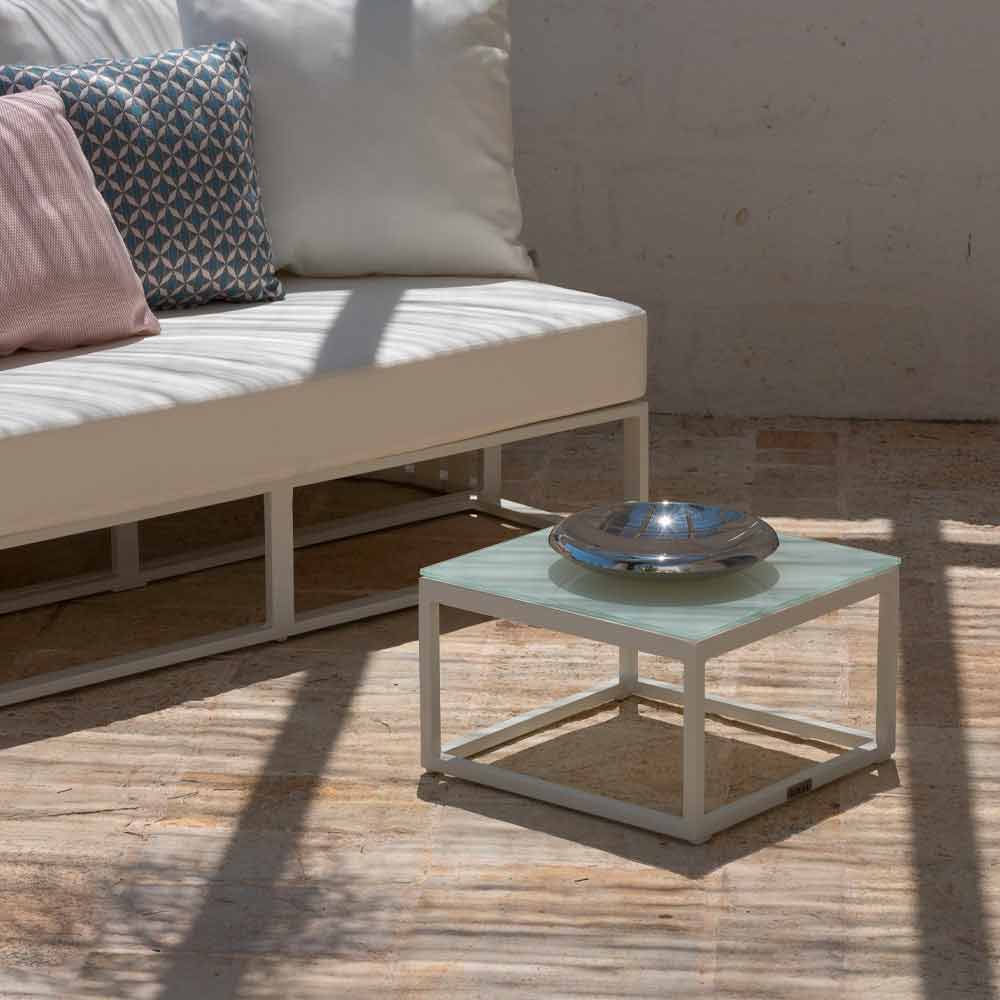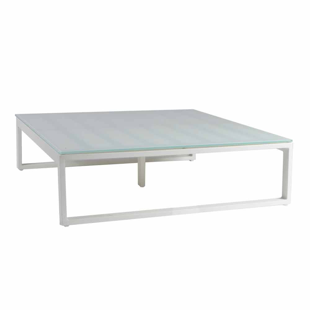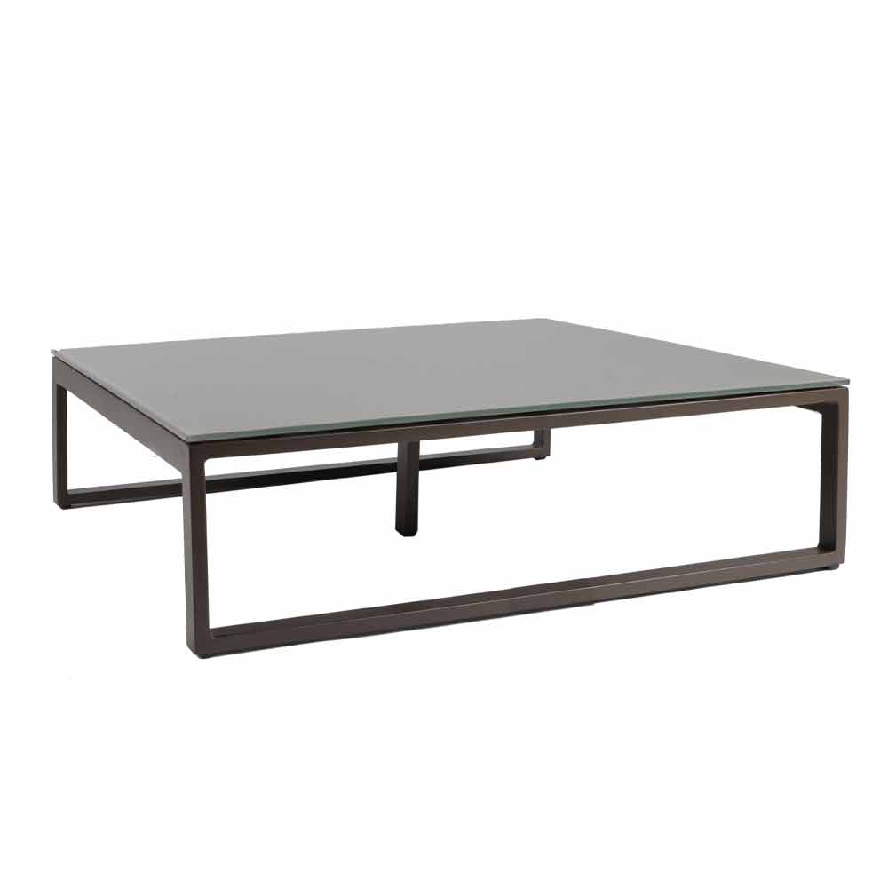 Low outdoor table with aluminum structure in 3 finishes and square glass or laminam top.