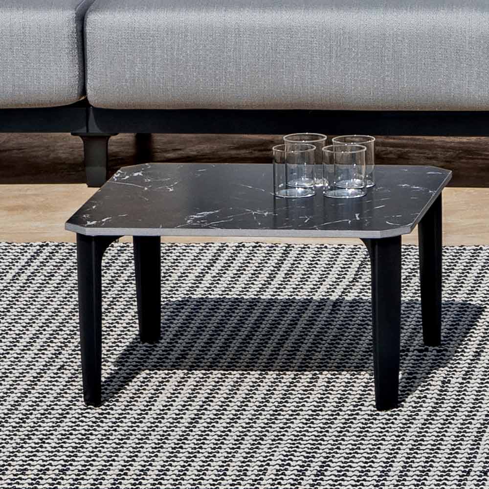 Low outdoor coffee table made of aluminum with a square top in stoneware, high quality article made in Italy.
