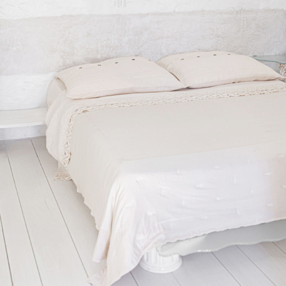 Thus, through the attention to detail and a genuine design that points to the essence of beauty, an authentic and artisanal product is born, of the highest quality for the selected raw materials, such as the purest linen and the softest cotton. The natural imperfection of the material thus denotes the value of simplicity , enclosed in an elegant and delicate craftsmanship for a sublime and suggestive sensory experience