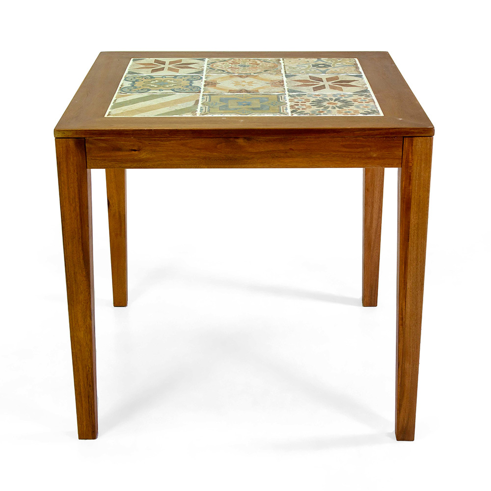 Outdoor table made with a natural color oiled acacia wood structure and top with 20x20 cm ceramic tiles.