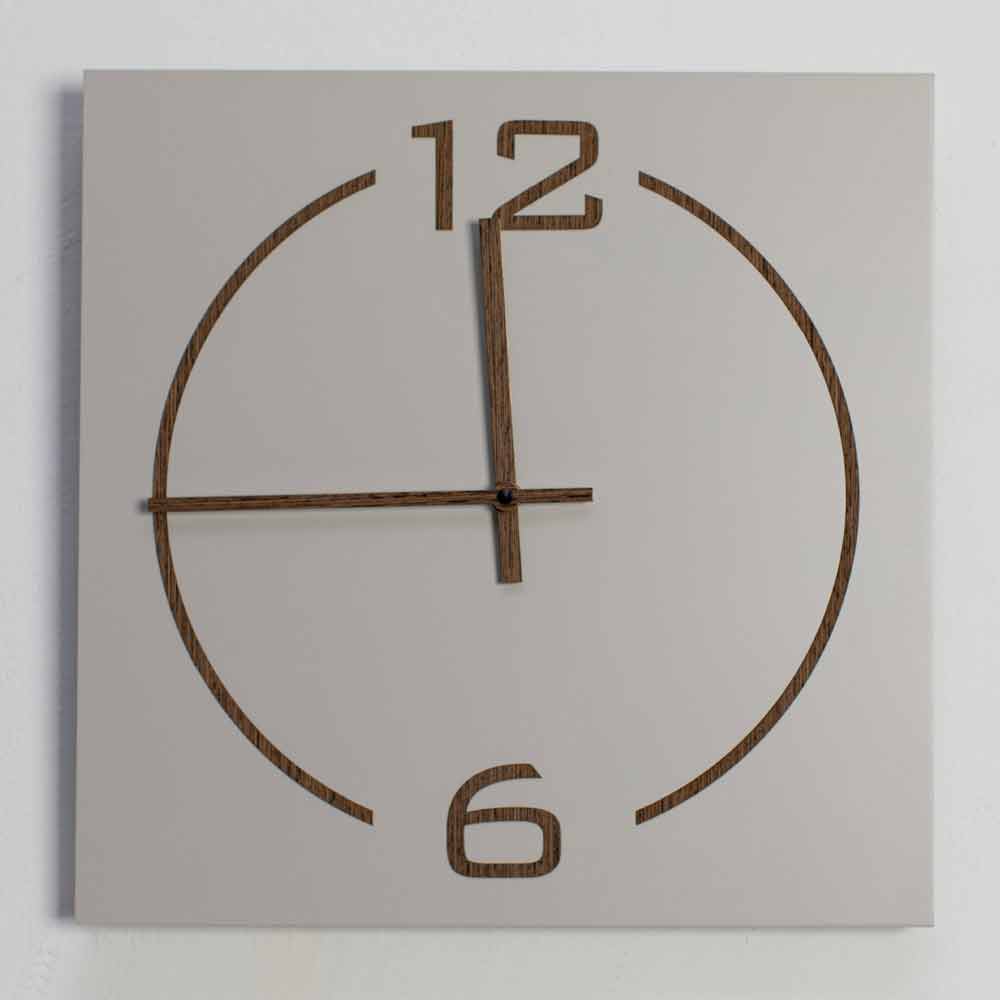 small round clock with simple and clean lines; it has a matt beige base and walnut-colored decorations and hands.