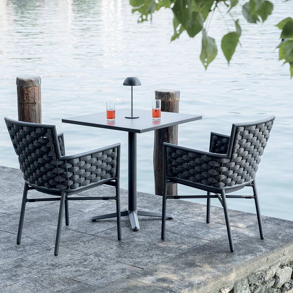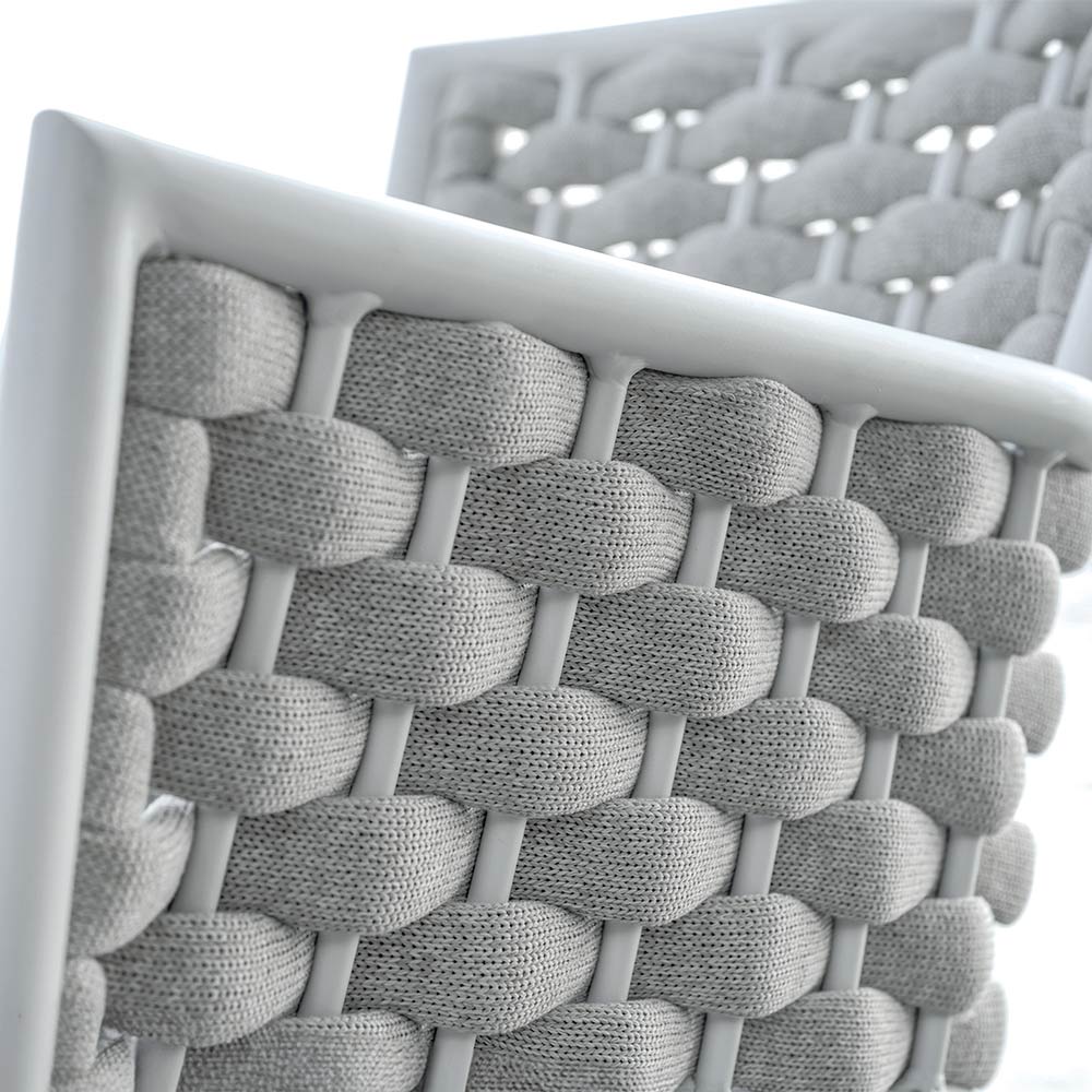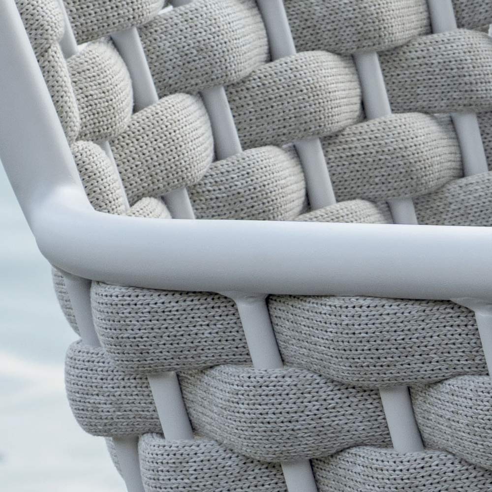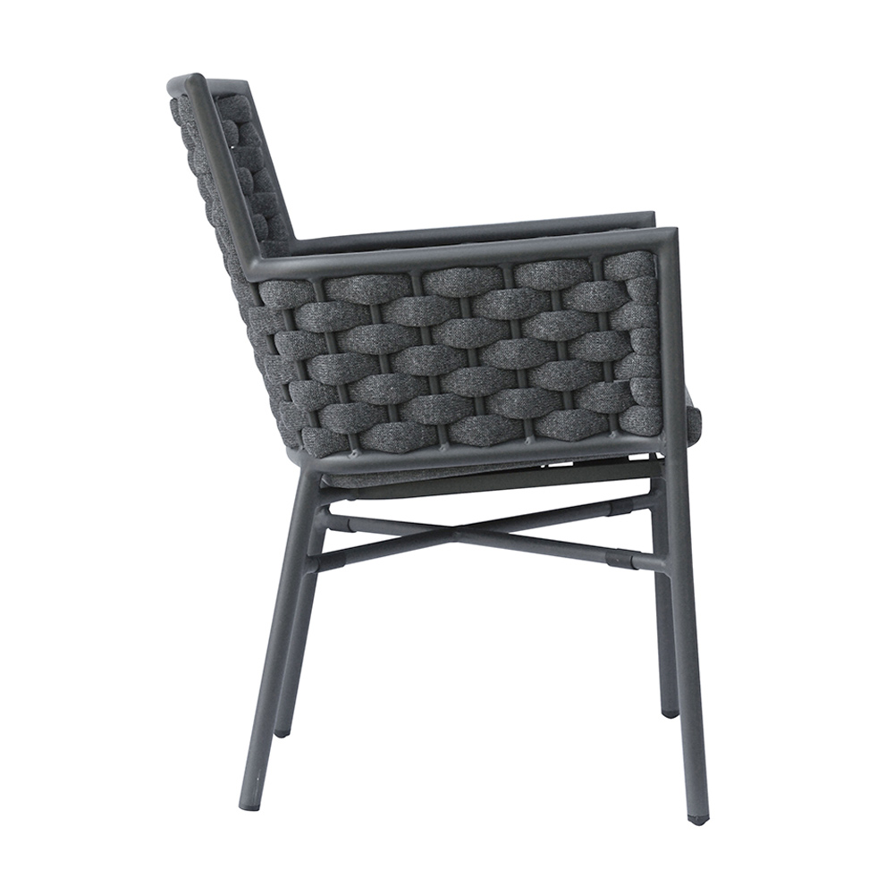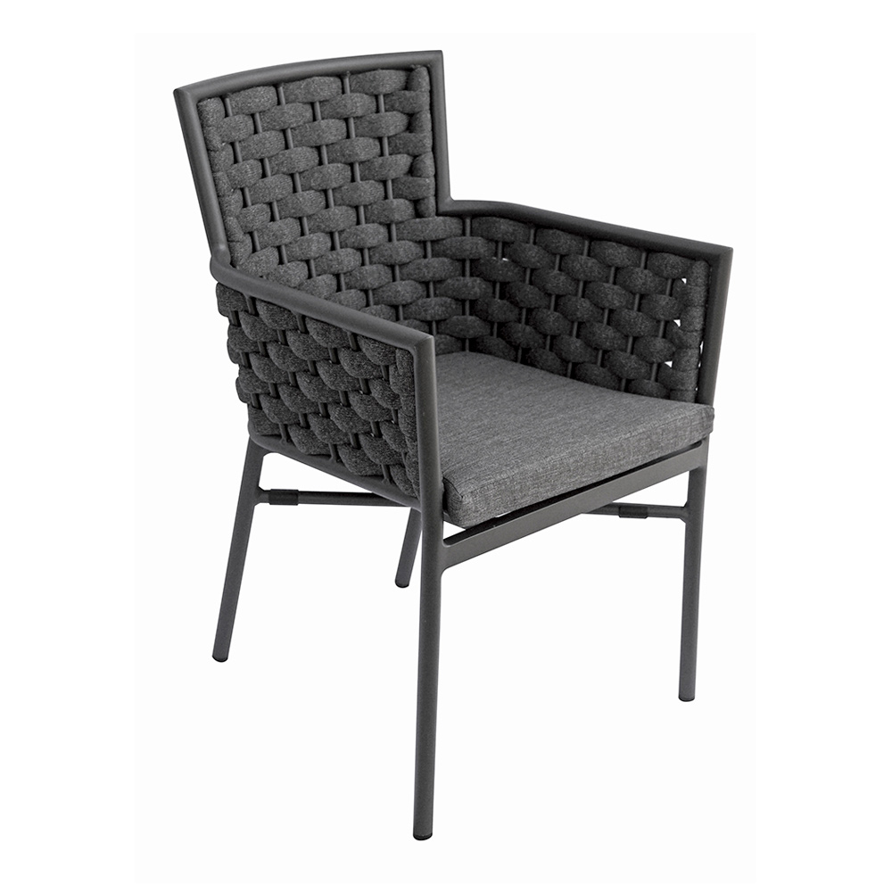 Refinement and comfort meet in this outdoor chair with a modern and cozy design. The soft and durable woven rope back and armrests add a touch of handcrafted elegance, while the upholstery provides superior comfort, ideal for relaxing moments outdoors.