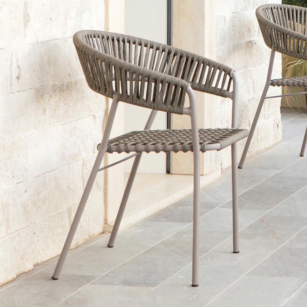 2 Stackable armchairs for outdoor furniture handcrafted in Italy in mud-colored galvanized steel with seat and backrest in mud-colored rope . The galvanization allows for greater resistance of the material finish to corrosive atmospheric agents such as salt and acidity of rain while the ropes are resistant to chlorine and solar rays as well as anti-mold.