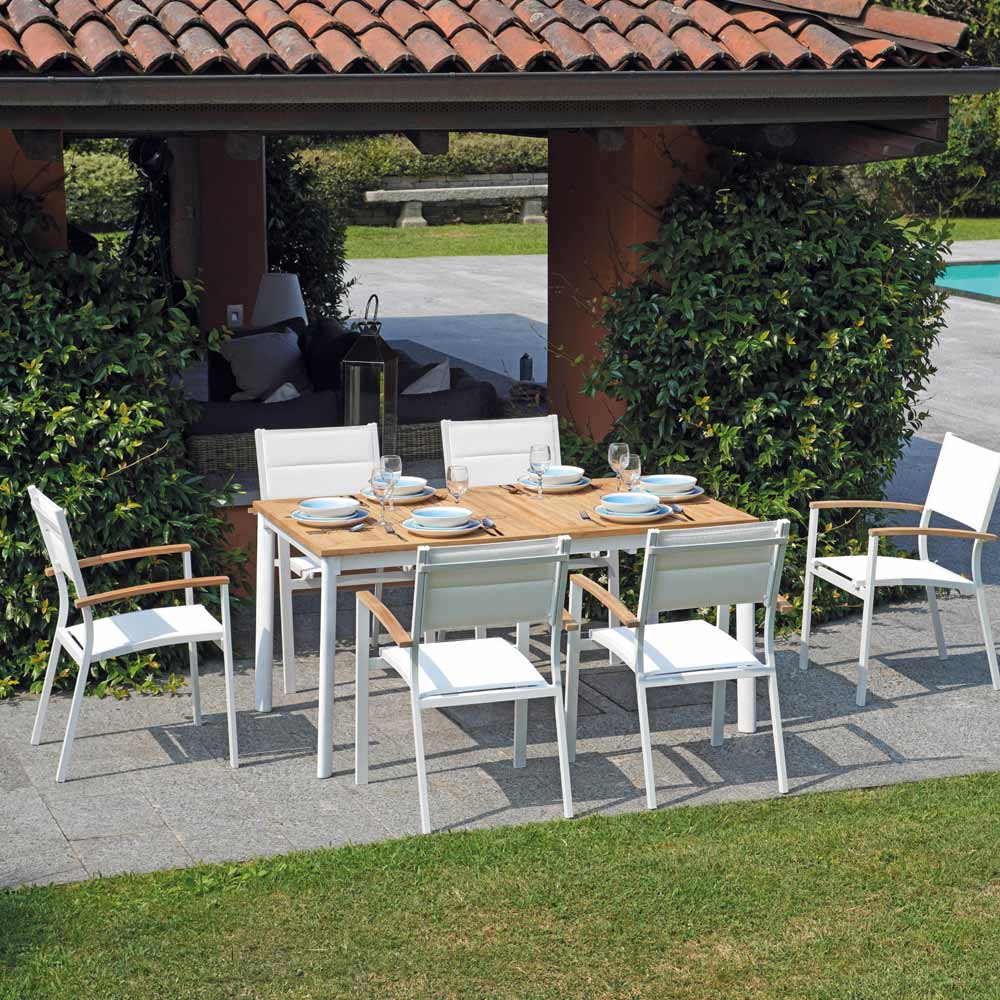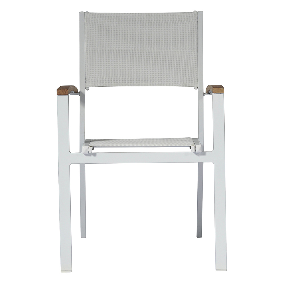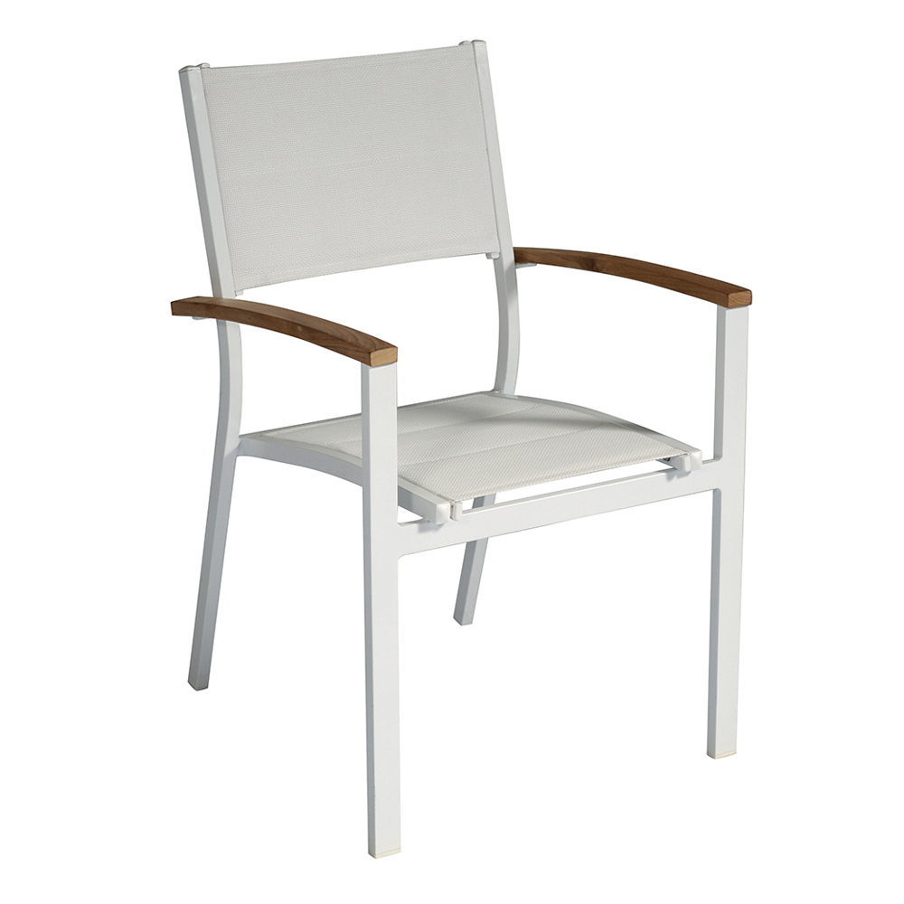 Stackable outdoor chair with structure made of aluminum and seat in ivory padded textilene enriched by elegant teak armrests. This outdoor chair combines design and simplicity, the result of simple but resistant materials that give life to a product with an original and avant-garde design, perfect to complete any context.