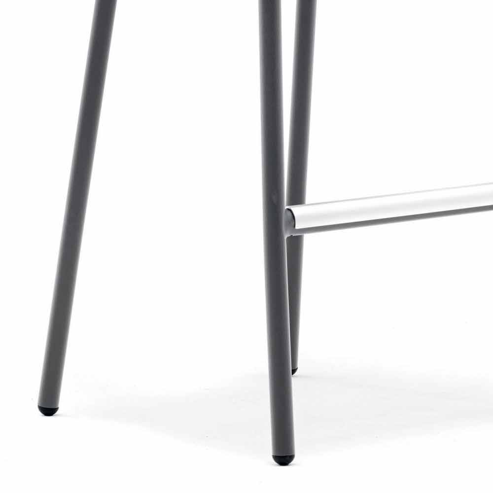 Modern design outdoor stackable stool with aluminum base and seat in white or ash colored technical fabric.