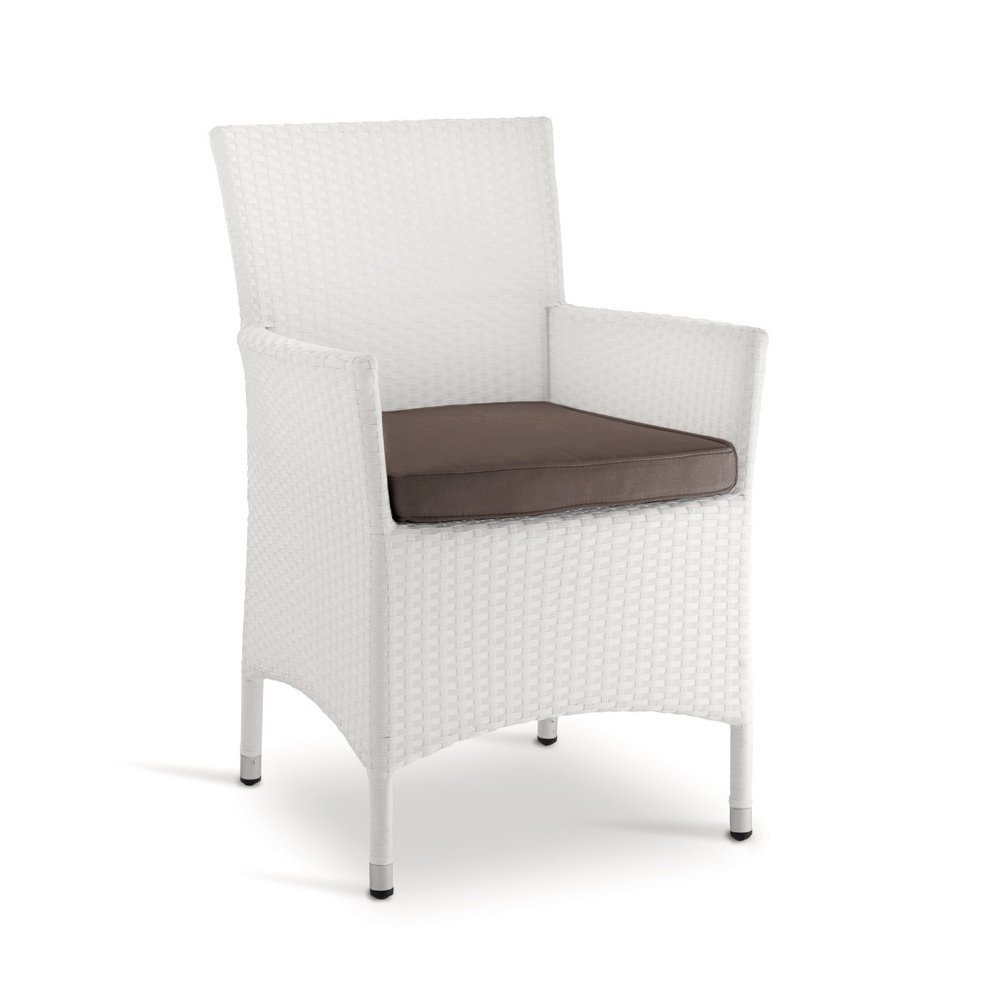 garden armchair made with an aluminum frame covered with white wicker and a seat cushion in mocha-colored fabric.