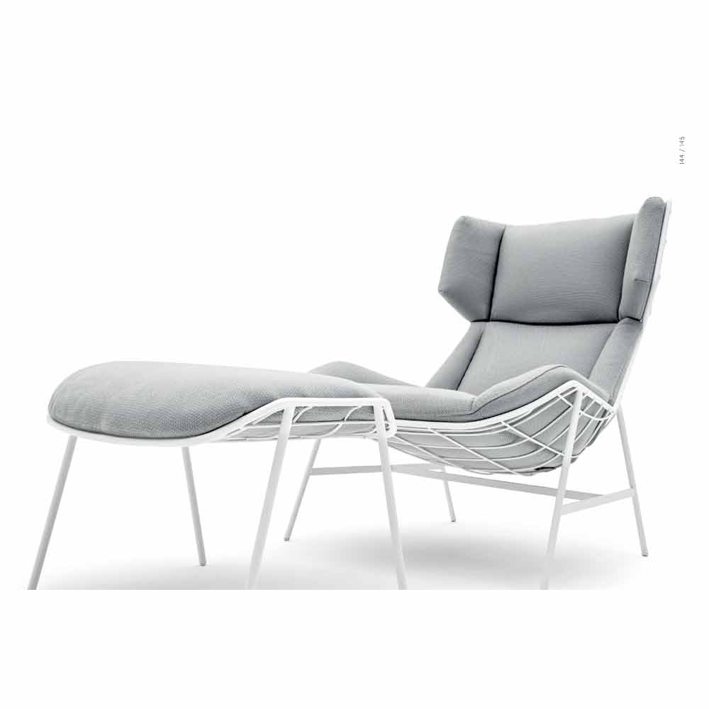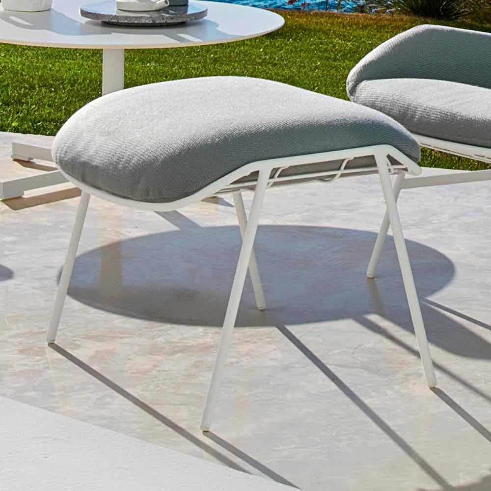 Summer Set is a prodigious garden pouf / footstool, characterized by a load-bearing structure in powder-coated steel with a choice between white or black; seat and back cushion covered in fabric and padded with Dryfeel rubbers.
