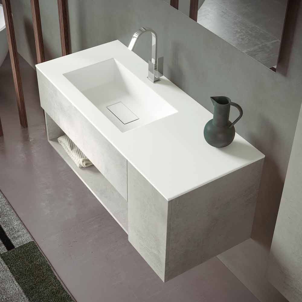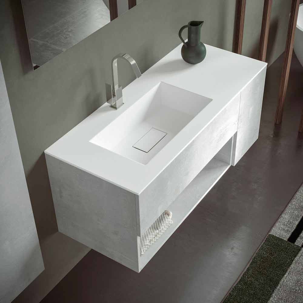 The washbasin base unit with drawer and open compartment is made of laminated and water-repellent hydro W 100 wood fiber , in order to ensure greater durability and prevent the cabinet from being damaged in contact with water.