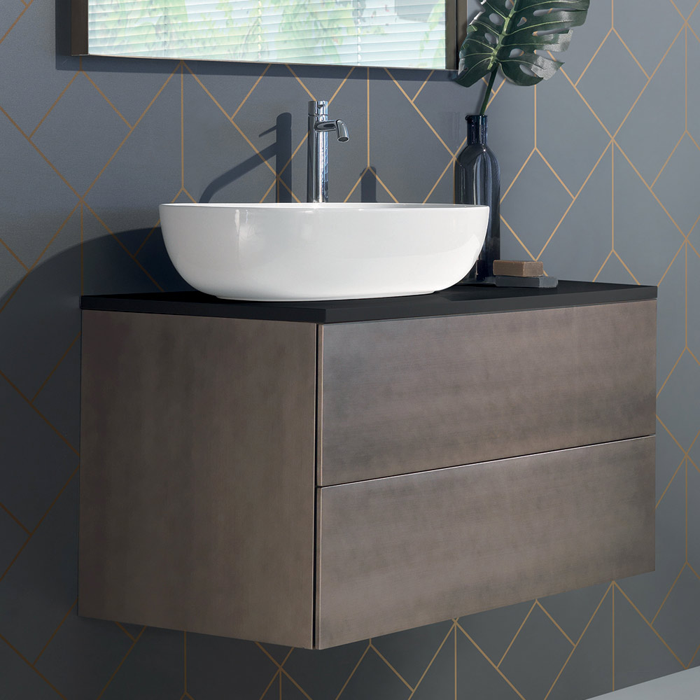 washbasin base with 2 drawers in MDF wood with a precious matt antiqued platinum lacquered finish, and a matt black lacquered wood top with white ceramic countertop washbasin.