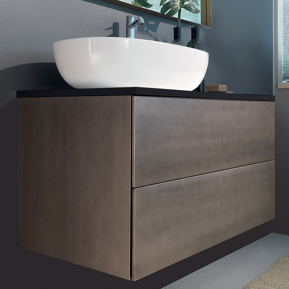 bathroom furniture composition is characterized by the purity of the lines and the highly refined finish.