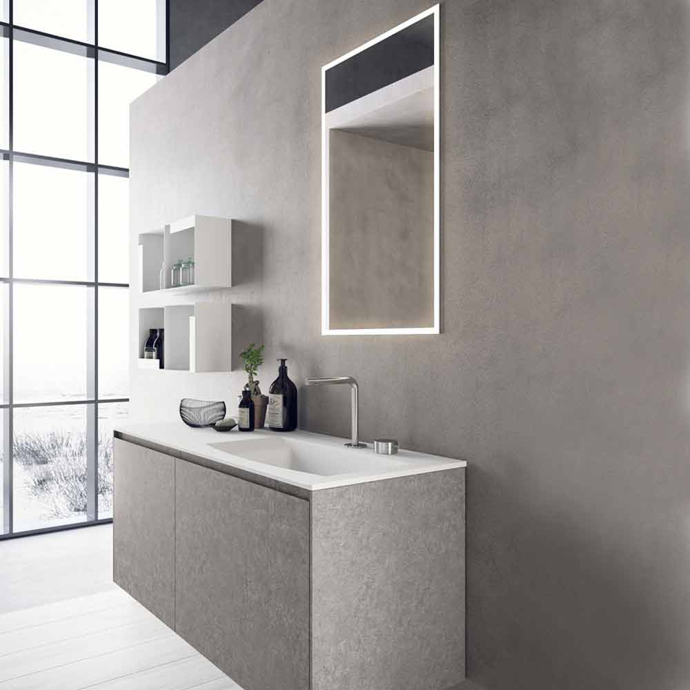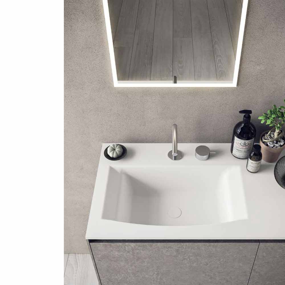 This formal clarity is given by the groove door with an inclined profile and by the ultra-minimal rectangular mirror with self-lighting frame.