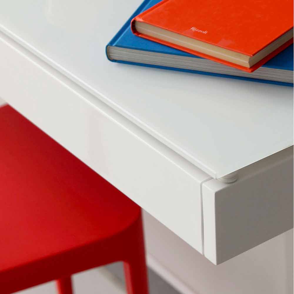 Suspended desk with wall mounting made in Italy with glass top in glossy white finish with cable hole, structure in matt white painted metal and removable vertical panel in white plexiglass . It is also complete with LED lighting positioned on the top and a practical pull-out drawer.
