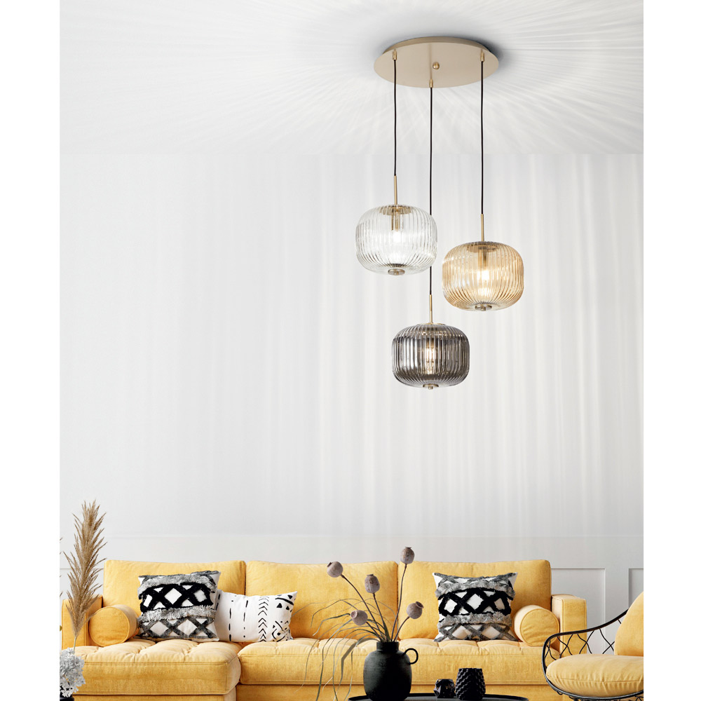 Suspension lamp with gold-coloured metal structure and three diffusers in striped colored blown glass. A design marked by elegant and refined shapes that give the room a classy taste, enriching its aesthetics thanks to an exclusive touch and a refined and innovative aesthetic . The three wonderful colors that underline the timeless elegance of blown glass give the final look of the product its true delicate essence and its strong contemporary personality, thus giving life to a furnishing solution that is as functional as it is aesthetically impressive and with a strong visual impact .
