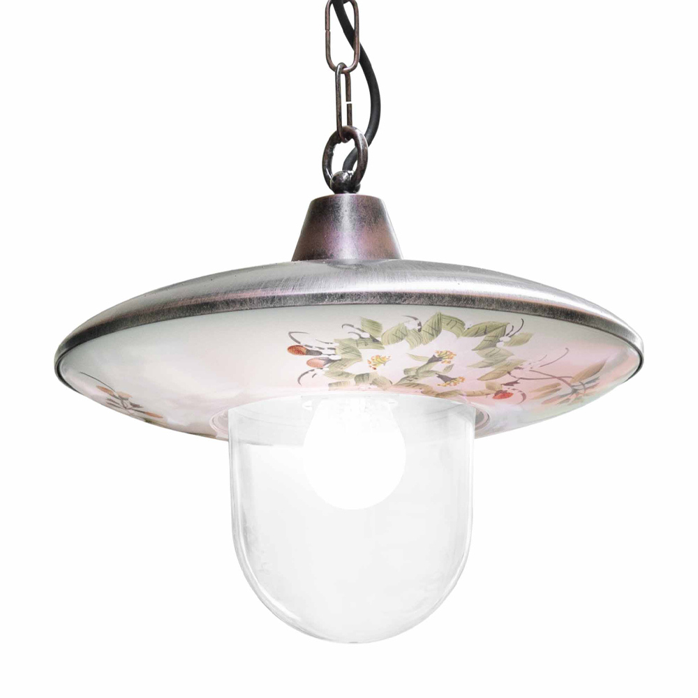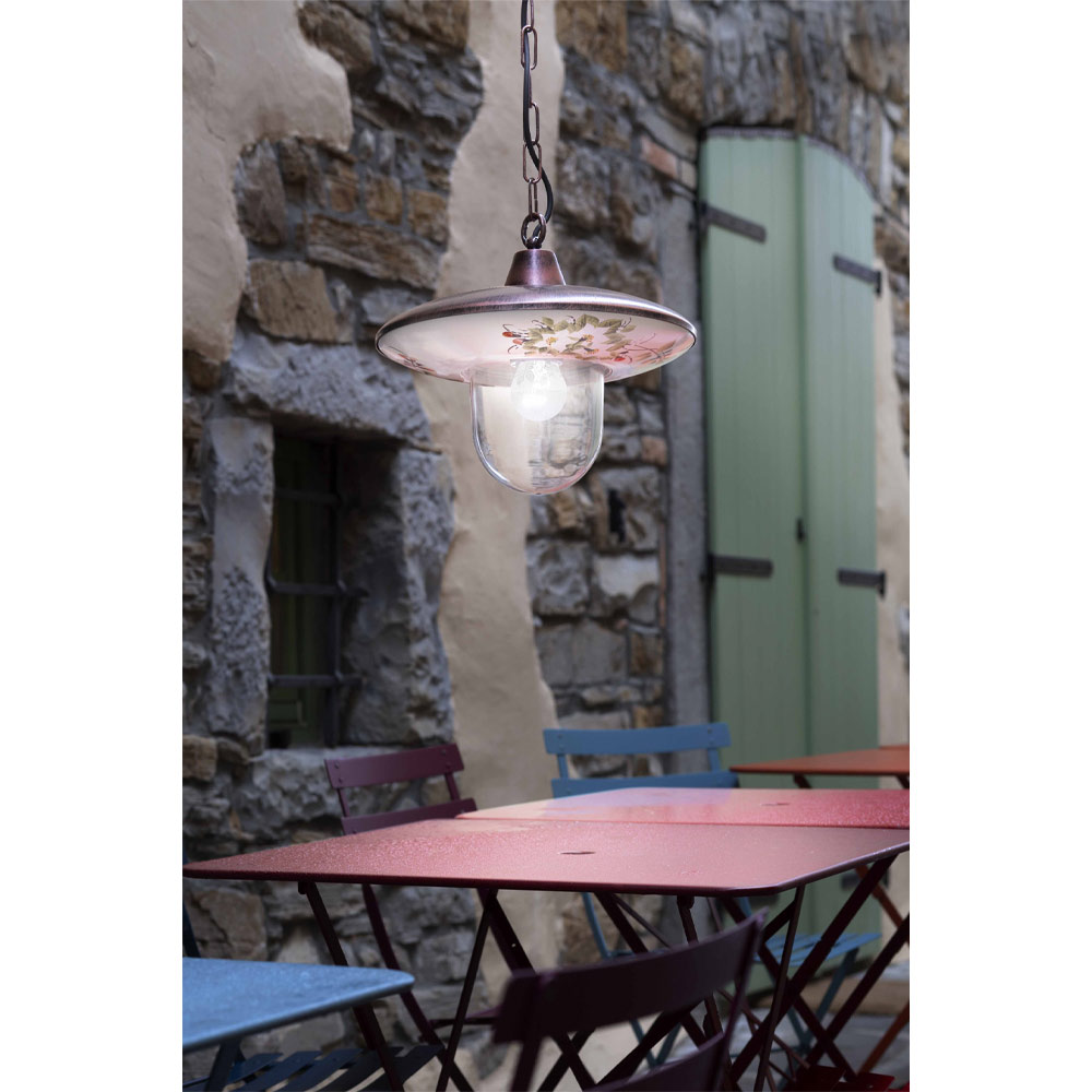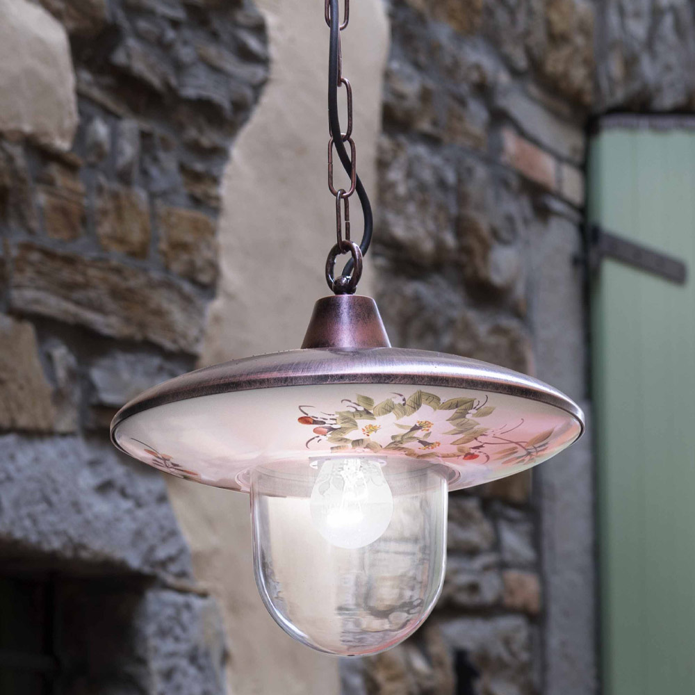 This pendant lamp for the outdoor space is entirely made of black aluminum with a copper shade and decorated with hand-painted flowers for a classic and harmonious style between shape and colors.