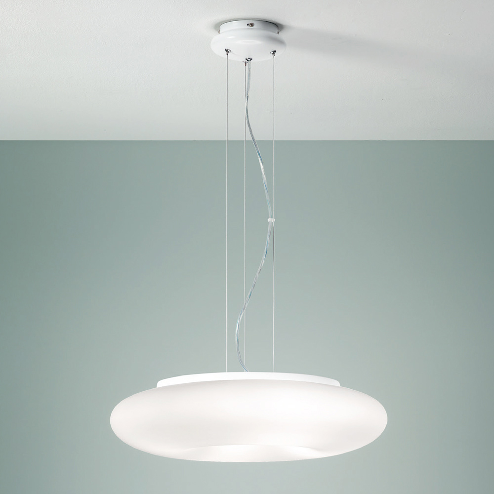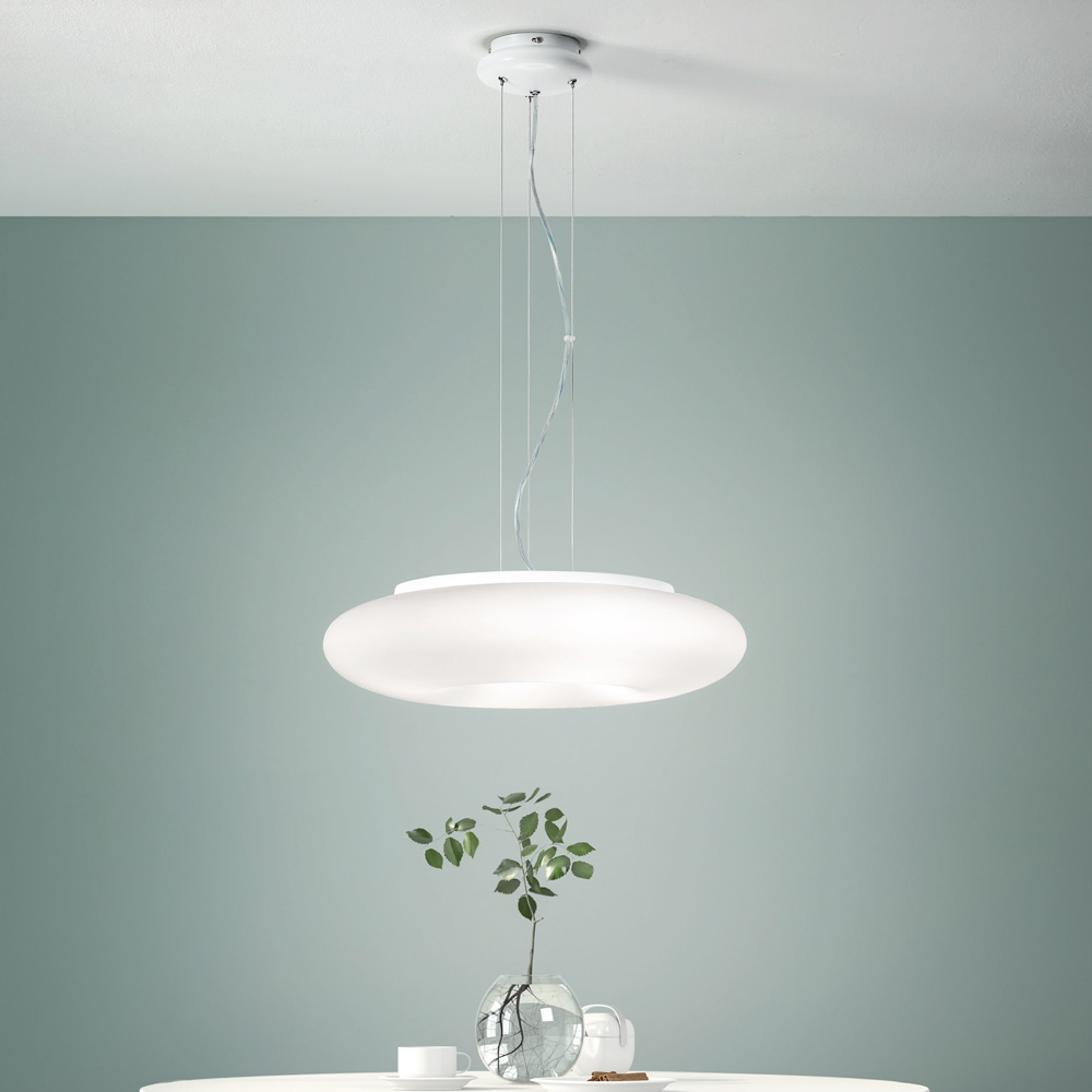 Suspension lamp with structure made of chromed metal and diffuser in blown and etched white glass complete with cables adjustable in length. Soft shapes and sinuous lines give life to a quality furnishing solution capable of enriching domestic spaces such as dining rooms, living rooms or bedrooms through a strong modern personality and a sober and elegant character . Its refined aesthetic is underlined and made unique by the choice to use blown glass, a sophisticated material which increases the exclusive side of the product and allows for particularly functional lighting .