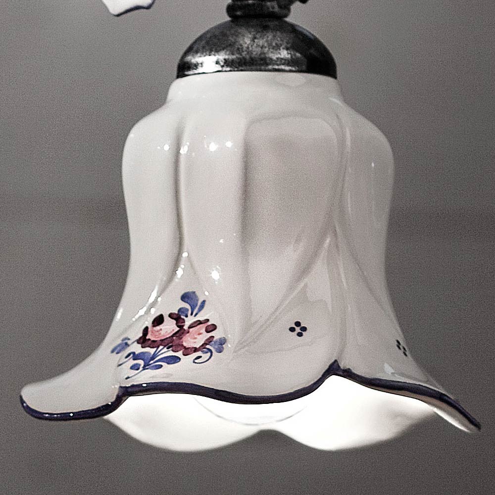 Suspended lamp in metal and ceramic with hand-painted roses made in Italy by Ferroluce.