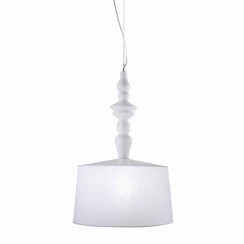 The lamp is made of glossy white ceramic as a material that represents the origin, the malleability, the creation and that leads directly to the origins of our culture. Lampshade in linen.