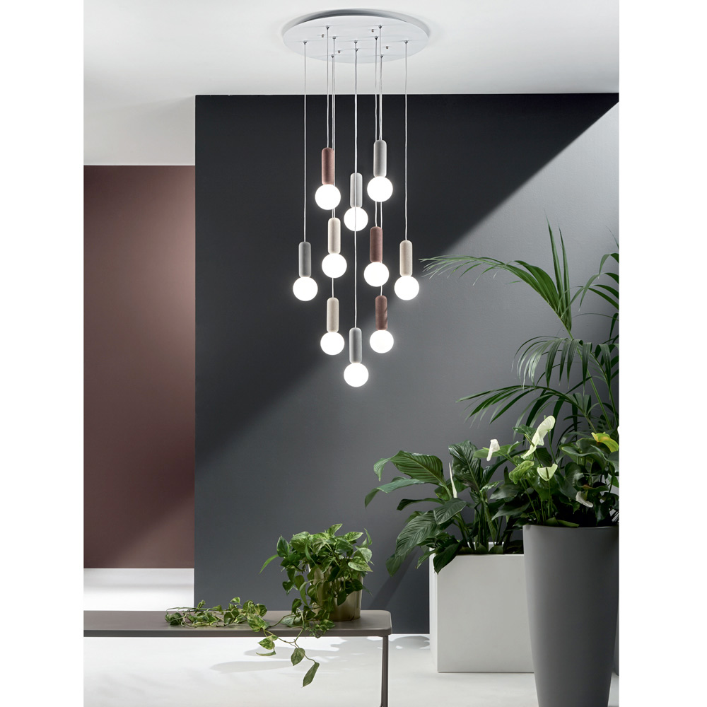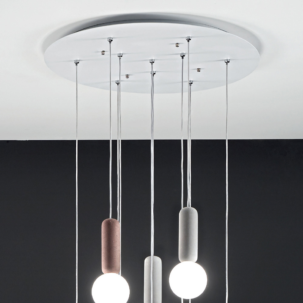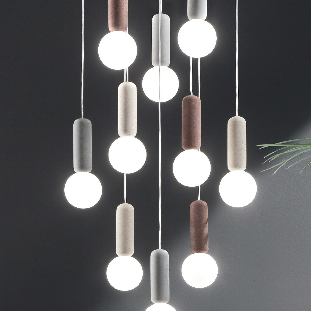 satin white glass complete with cables adjustable in length. An unusual and creative combination of materials and finishes that brings to life a furnishing solution that is as eccentric as it is elegant and modern. The wonderful color nuances chosen for the concrete components combine impeccably with the delicate and romantic finish of the glass lampshades for a result with a