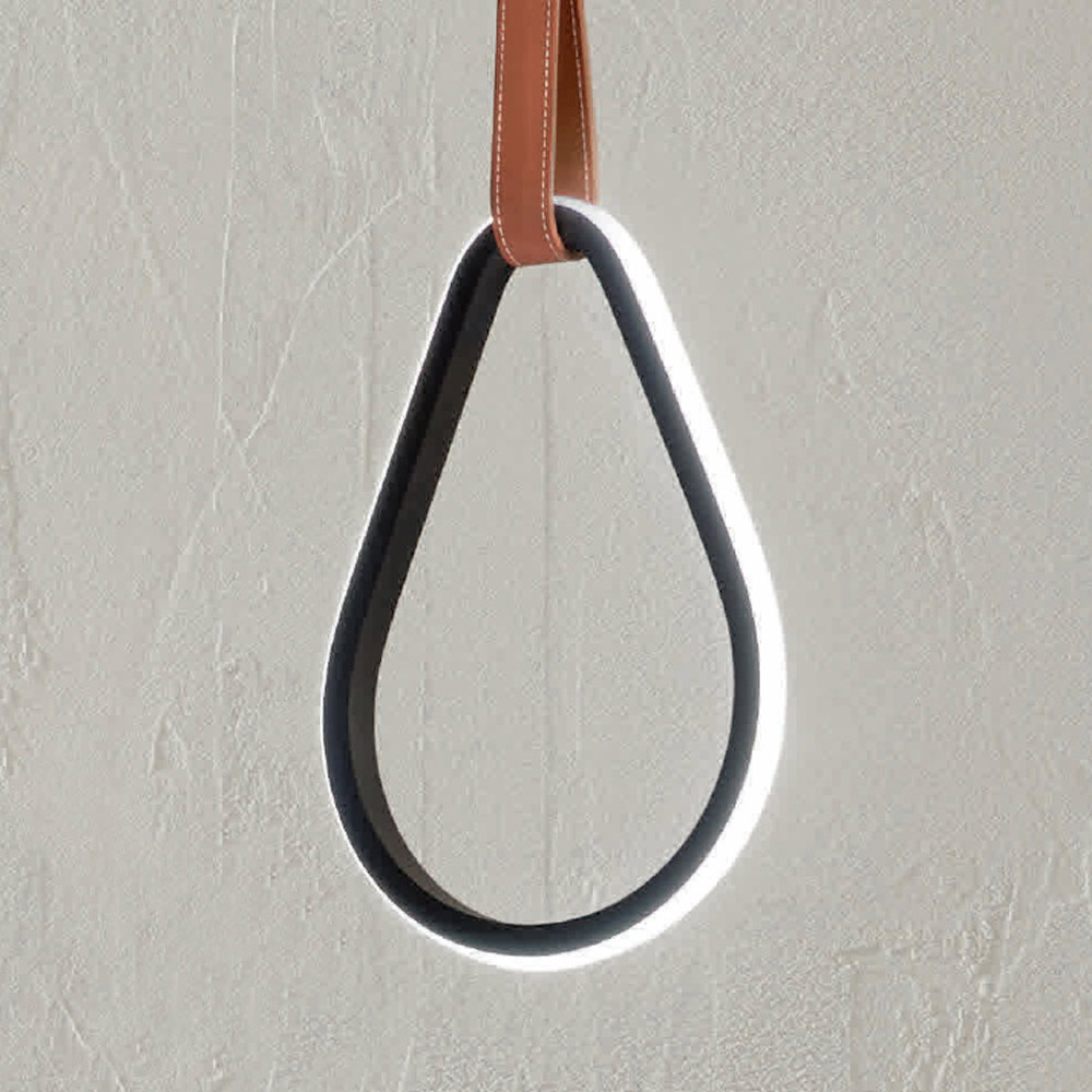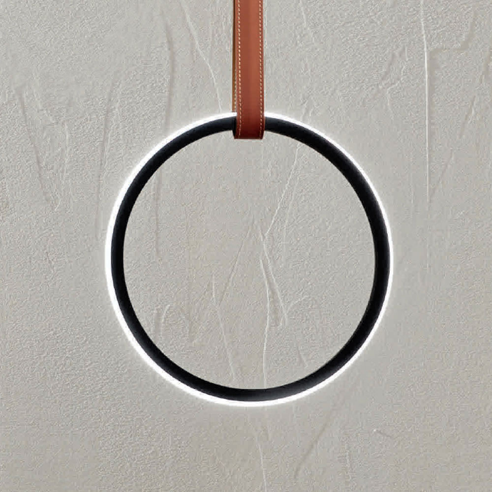 Pendant lamp entirely produced in Italy made of black painted metal and tan eco-leather element with adjustable length cables and dimmable LED lights in different geometric shapes.