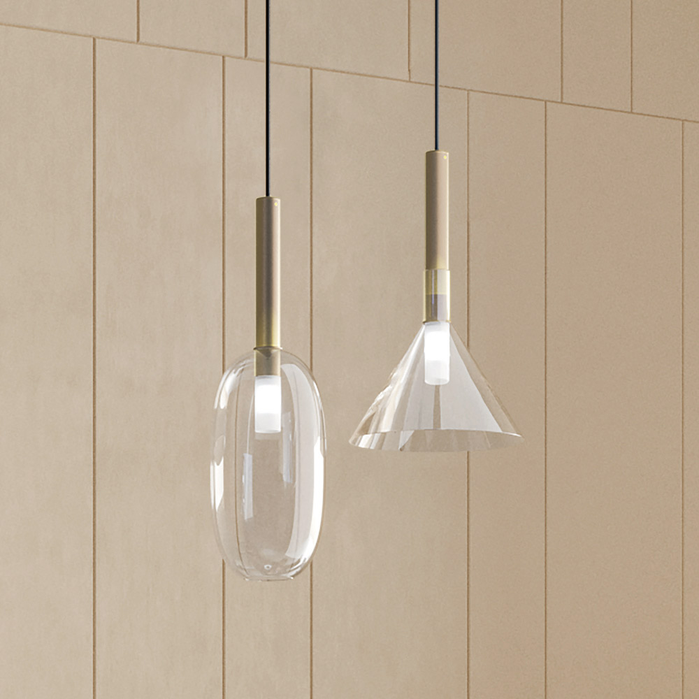 Made in Italy. From the combination of a cylindrical element in natural brass and glass diffusers of different shapes, a delicate and elegant collection is born. Suspension lamps that can be composed to make every environment unique and special, in an alchemy of proportions, combinations, dimensions, shapes and materials.