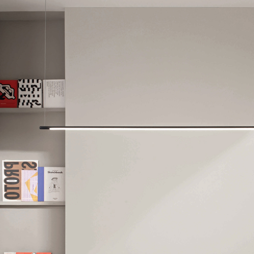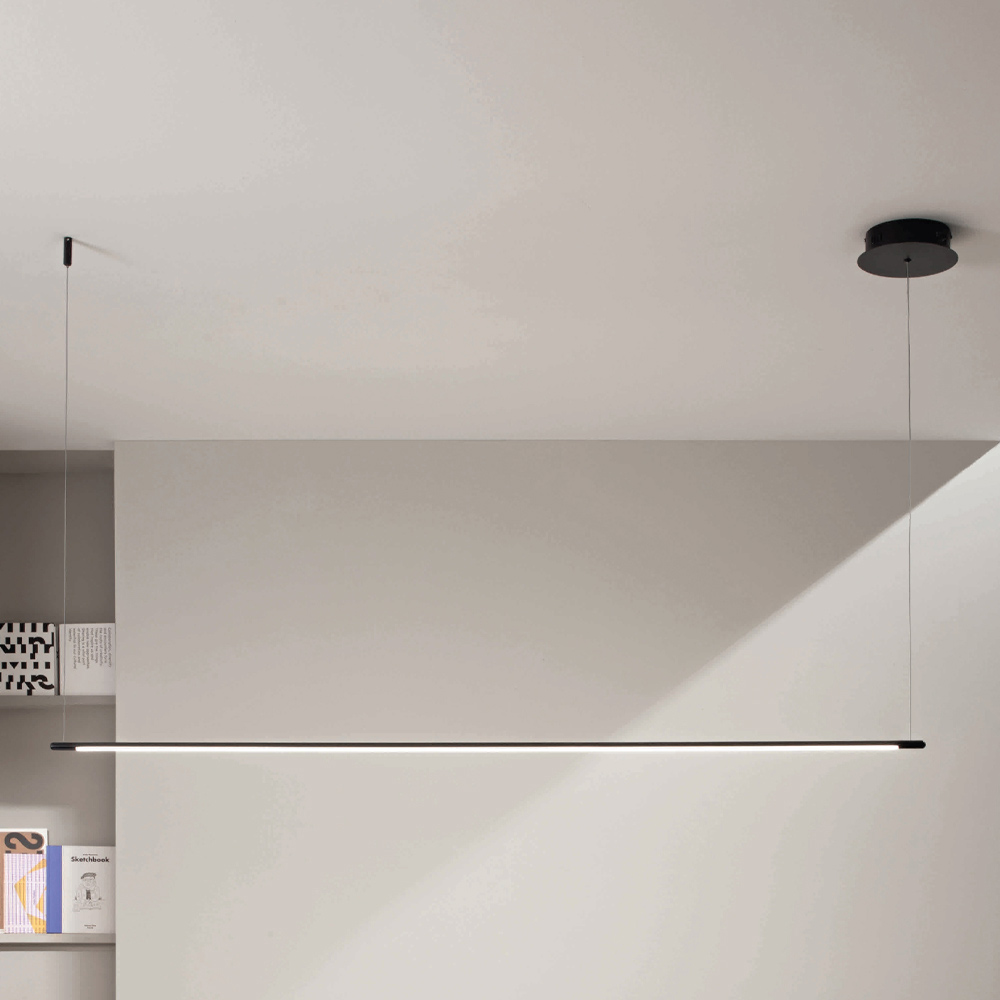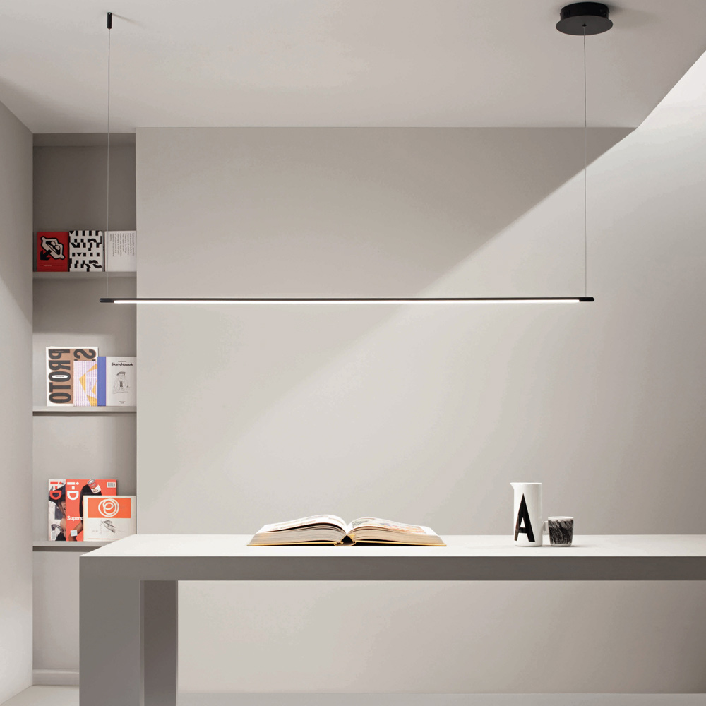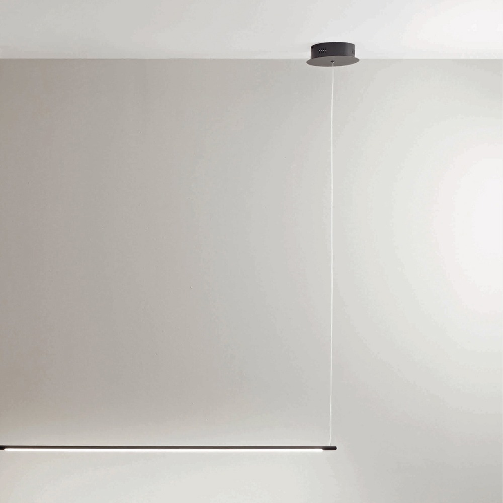 Pendant lamp entirely produced in Italy made of painted metal in black finish with dimmable LED light and length- adjustable cables .