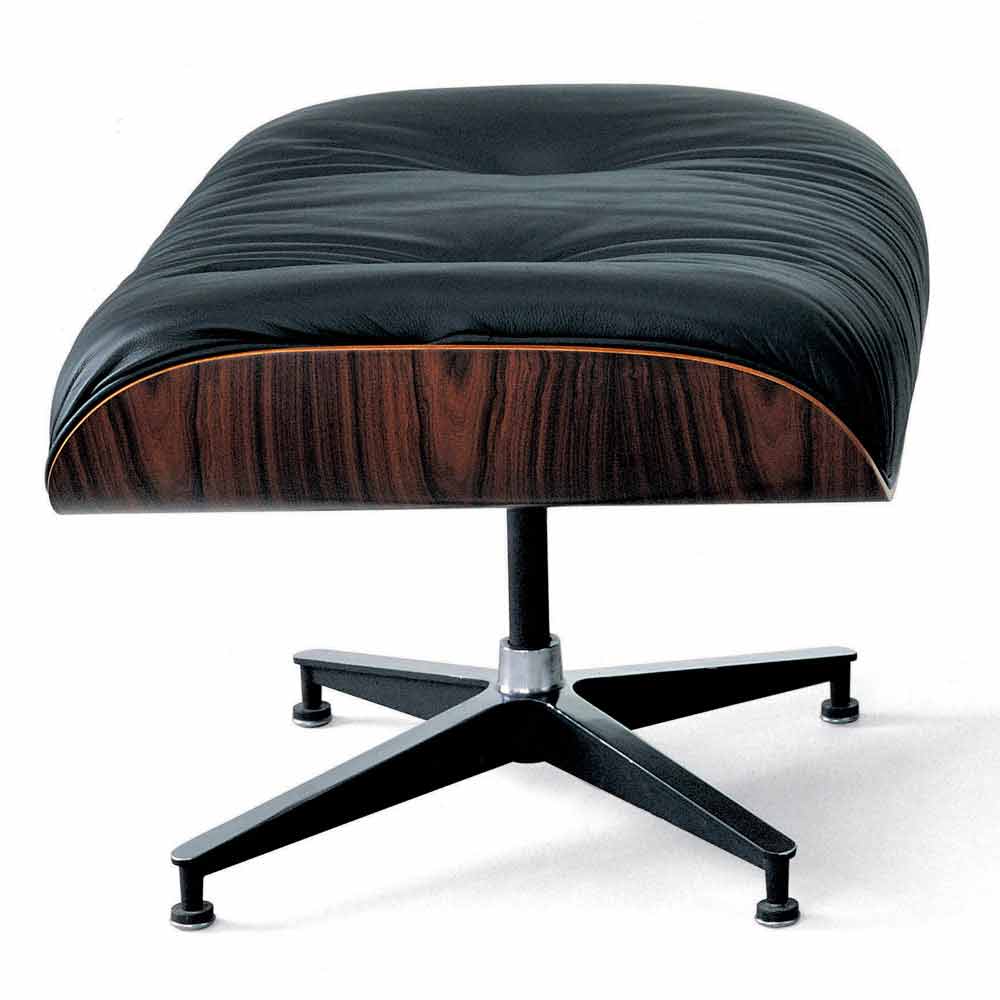Swivel armchair entirely made in Italy with aluminum base, rosewood shell, polyurethane foam and polyester fiber cushions and leather upholstery complete with footrest pouf matching the armchair. An idea of furniture that blends in itself the elegance of the chosen materials and the functionality of its conformations, offering a