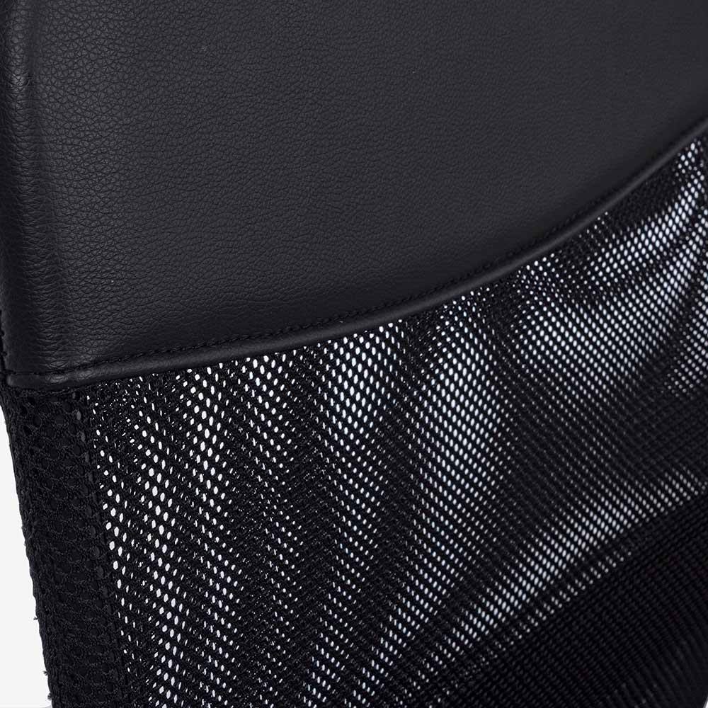 The height-adjustable seat is padded and upholstered in 100% polyester fabric while the backrest is upholstered in 100% polyester mesh fabric with imitation leather insert.