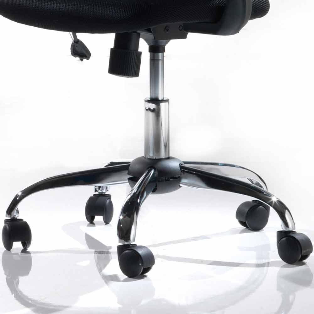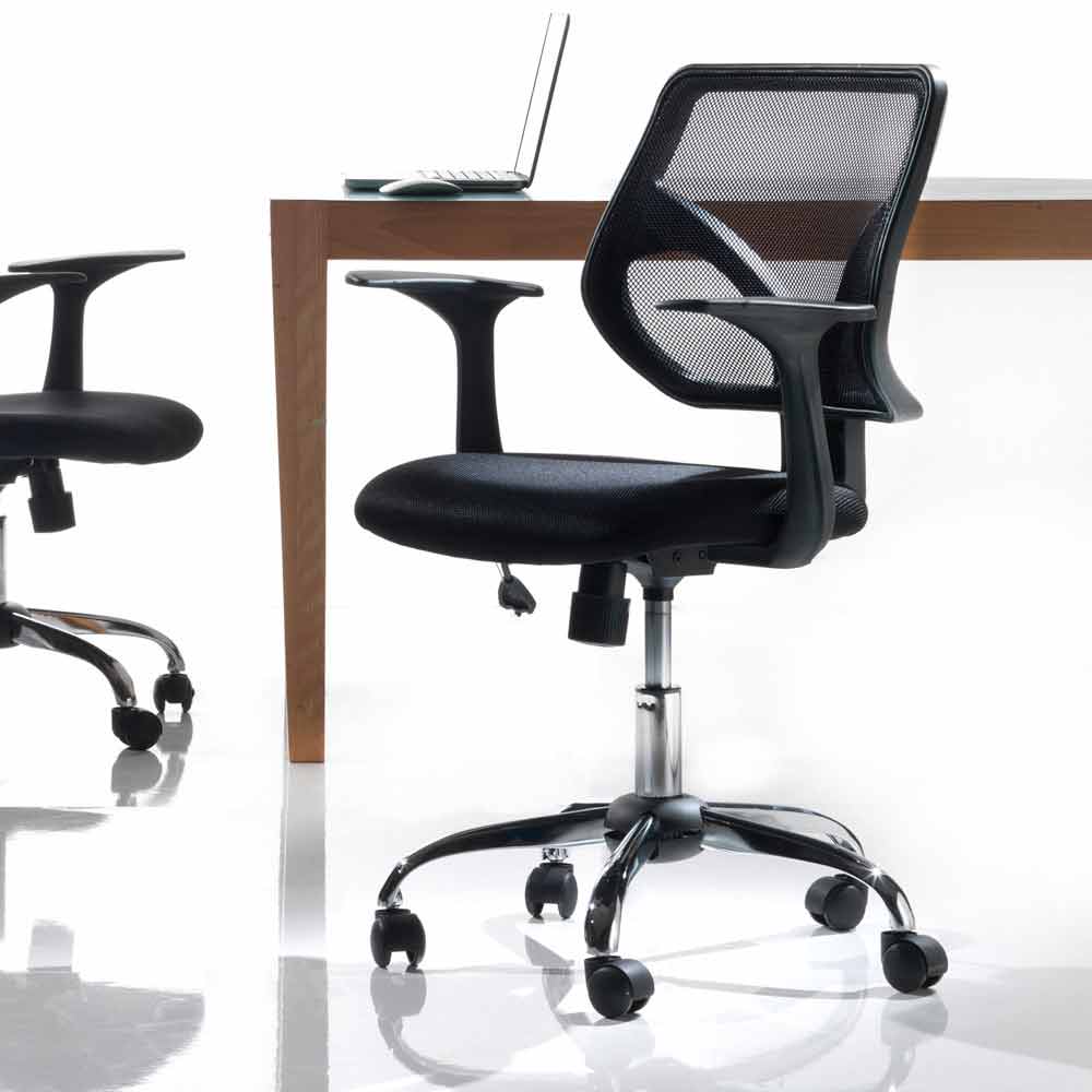 The Giovanna swivel office chair is ideal to give freedom of movement and maximum comfort to the user; it comes with a swivel seat with gas lift, chromed metal structure with polyurethane wheels; seat covered in black puma and back in black micro-perforated technorete.