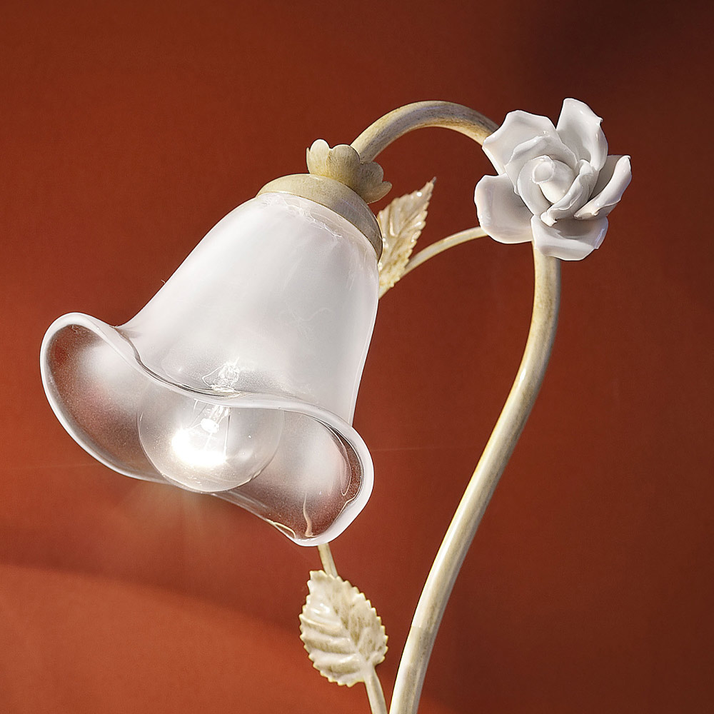 Table lamp in iron, glass and ceramic rose decoration made in Italy by Ferroluce.