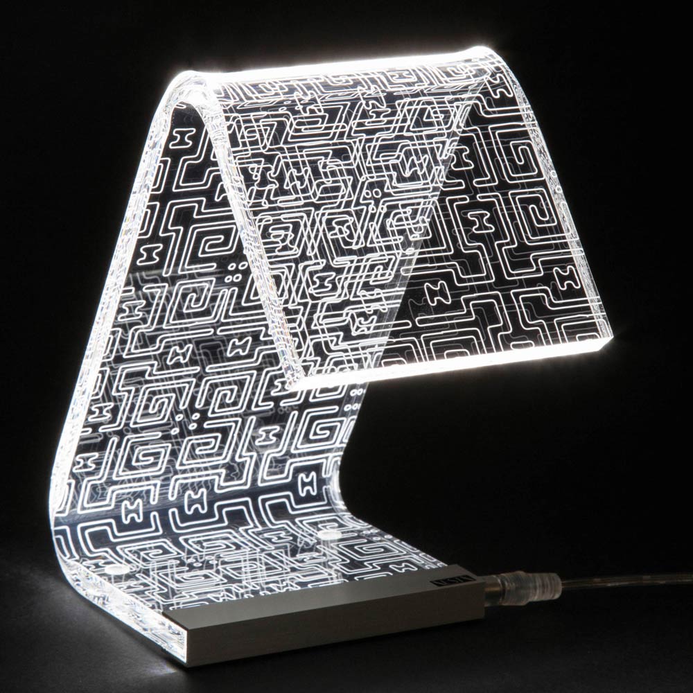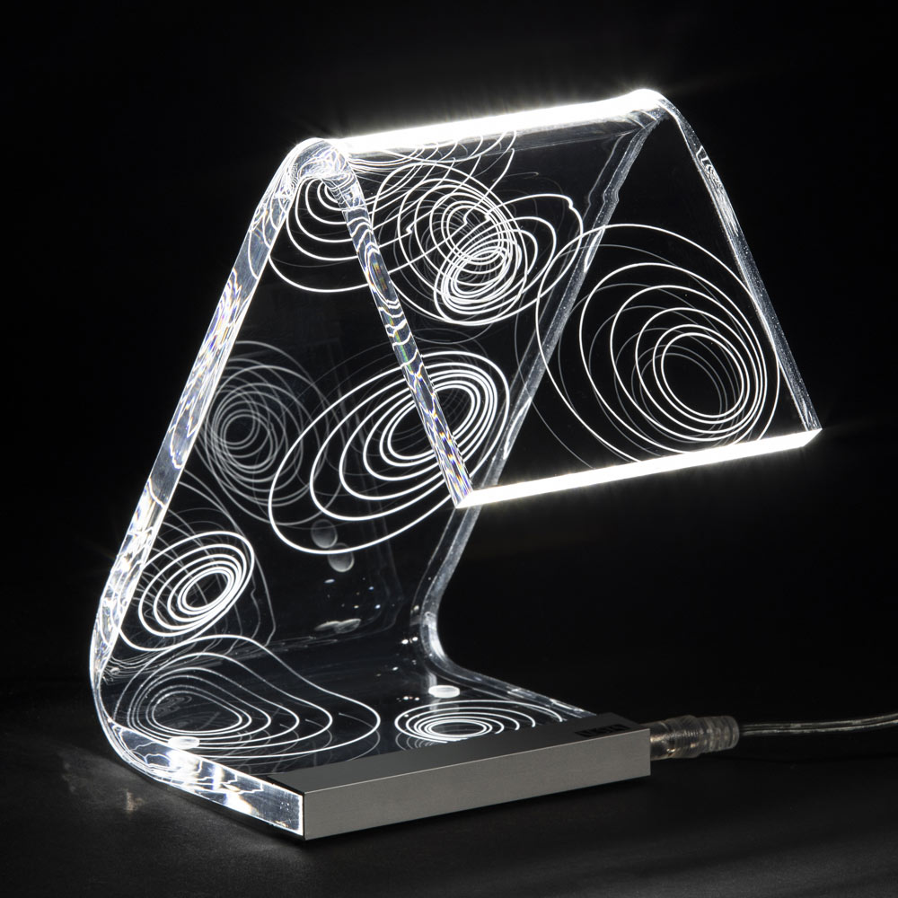 Table lamp in transparent acrylic crystal with laser decorations, 2 sizes made in Italy.