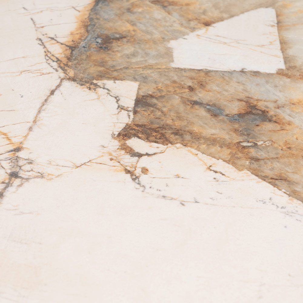 Dining table made with a 12 mm thick solid surface ceramic (stoneware) top with a Magellano finish, a subframe in okumè marine plywood and a 35 mm thick solid natural teak base, entirely Made in Italy.